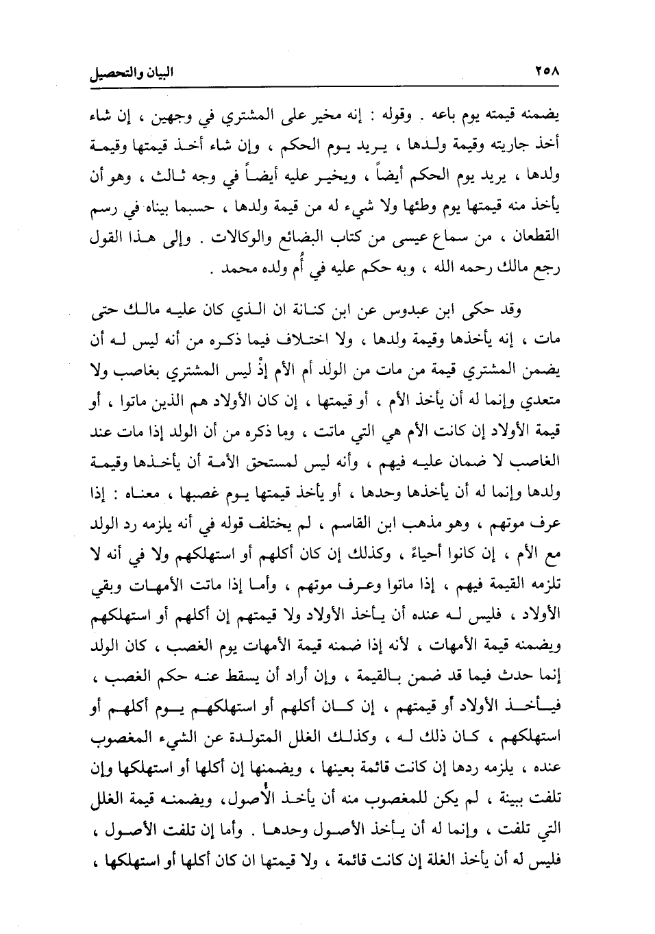 وقد حكى ابن عبدوس عن ابن كنانة أن الذي كان عليه مالك حتى مات، إنه يأخذها وقيمة ولدها، ولا اختلاف فيما ذكره من أنه ليس له أن يضمن المشتري قيمة من مات من الولد أم الأم إذ ليس المشتري بغاصب ولا متعد وإنما له أن يأخذ الأم، أو قيمتها، إن كان الأولاد هم الذين ماتوا، أو قيمة الأولاد إن كانت الأم هي التي ماتت، وما ذكره من أن الولد إذا مات عند الغاصب لا ضمان عليه فيهم، وأنه ليس لمستحق الأمة أن يأخذها وقيمة ولدها وإنما له أن يأخذها وحدها، أو يأخذ قيمتها يوم غصبها، معناه: إذا عرف موتهم، وهو مذهب ابن القاسم، لم يختلف قوله في أنه يلزمه رد الولد مع الأم، إن كانوا أحياء، وكذلك إن كان أكلهم أو استهلكهم ولا في أنه لا تلزمه القيمة فيهم، إذا ماتوا وعرف موتهم، وأما إذا ماتت الأمهات وبقي الأولاد، فليس له عنده أن يأخذ الأولاد ولا قيمتهم إن أكلهم أو استهلكهم ويضمنه قيمة الأمهات؛ لأنه إذا ضمنه قيمة الأمهات يوم الغصب، كان الولد إنما حدث فيما قد ضمن بالقيمة، وإن أراد أن يسقط عنه حكم الغصب، فيأخذ الأولاد أو قيمتهم، إن كان أكلهم أو استهلكهم يوم أكلهم أو استهلكهم، كان ذلك له، وكذلك الغلل المتولدة عن الشيء المغصوب عنده، يلزمه ردها إن كانت قائمة بعينها، ويضمنها إن أكلها أو استهلكها وإن تلفت ببينة، لم يكن للمغصوب منه أن يأخذ الأصول، ويضمنه قيمة الغلل التي تلفت، وإنما له أن يأخذ الأصول وحدها. وأما إن تلفت الأصول، فليس له أن يأخذ الغلة إن كانت قائمة، ولا قيمتها إن كان أكلها أو استهلكها،
