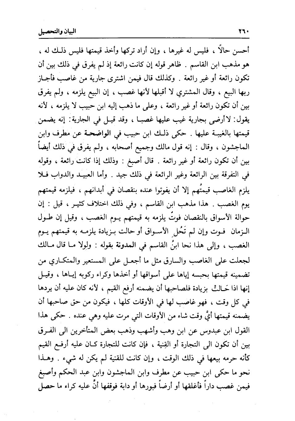 أحسن حالا، فليس له غيرها، وإن أراد تركها وأخذ قيمتها فليس ذلك له، هو مذهب ابن القاسم. ظاهر قوله إن كانت رائعة إذ لم يفرق في ذلك بين أن تكون رائعة أو غير رائعة. وكذلك قال فيمن اشترى جارية من غاصب فأجاز ربها البيع، وقال المشتري: لا أقبلها لأنها غصب، إن البيع يلزمه، ولم يفرق بين أن تكون رائعة أو غير رائعة، وعلى ما ذهب إليه ابن حبيب لا يلزمه؛ لأنه يقول: لا أرضى بجارية غيب عليها غصبا، وقد قيل في الجارية: إنه يضمن قيمتها بالغيبة عليها. حكى ذلك ابن حبيب في الواضحة عن مطرف وابن الماجشون، وقال: إنه قول مالك وجميع أصحابه، ولم يفرق في ذلك أيضا بين أن تكون رائعة أو غير رائعة. قال أصبغ: وذلك إذا كانت رائعة، وقوله في التفرقة بين الرائعة وغير الرائعة في ذلك جيد. وأما العبيد والدواب فلا يلزم الغاصب قيمتهم إلا أن يفوتوا عنده بنقصان في أبدانهم، فيلزمه قيمتهم يوم الغصب. هذا مذهب ابن القاسم، وفي ذلك اختلاف كثير، قيل: إن حوالة الأسواق بالنقصان فوت يلزمه به قيمتهم يوم الغصب، وقيل إن طول الزمان فوت وإن لم تحل الأسواق أو حالت بزيادة يلزمه به قيمتهم يوم الغصب، وإلى هذا نحا ابن القاسم في المدونة بقوله: ولولا ما قال مالك لجعلت على الغاصب والسارق مثل ما أجعل على المستعير والمتكاري من تضمينه قيمتها بحبسه إياها على أسواقها أو أخذها وكراء ركوبه إياها، وقيل إنها إذا حالت بزيادة فلصاحبها أن يضمنه أرفع القيم؛ لأنه كان عليه أن يردها في كل وقت، فهو غاصب لها في الأوقات كلها، فيكون من حق صاحبها أن يضمنه قيمتها أي وقت شاء من الأوقات التي مرت عليه وهي عنده. حكى هذا القول ابن عبدوس عن ابن وهب وأشهب وذهب بعض المتأخرين إلى الفرق بين أن تكون إلى التجارة أو القنية، فإن كانت للتجارة كان عليه أرفع القيم كأنه حرمه بيعها في ذلك الوقت، وإن كانت للقنية لم يكن له شيء. وهذا نحو ما حكى ابن حبيب عن مطرف وابن الماجشون وابن عبد الحكم وأصبغ فيمن غصب دارا فأغلقها أو أرضا فبورها أو دابة فوقفها أن عليه كراء ما حصل