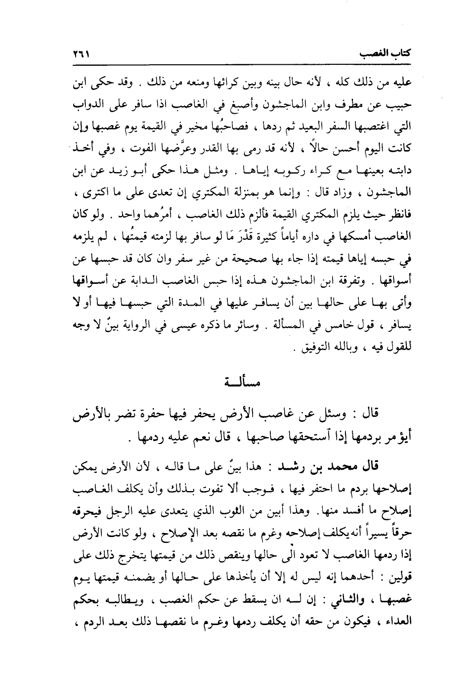 قال محمد بن رشد: هذا بين على ما قاله؛ لأن الأرض يمكن إصلاحها بردم ما احتفر فيها، فوجب ألا تفوت بذلك وأن يكلف الغاصب إصلاح ما أفسد منها. وهذا أبين من الثوب الذي يتعدى عليه الرجل فيحرقه حرقا يسيرا أنه يكلف إصلاحه وغرم ما نقصه بعد الإصلاح، ولو كانت الأرض إذا ردمها الغاصب لا تعود إلى حالها وينقص ذلك من قيمتها يتخرج ذلك على قولين: أحدهما: إنه ليس له إلا أن يأخذها على حالها أو يضمنه قيمتها يوم غصبها، والثاني: إن له إن يسقط عن حكم الغصب، ويطالبه بحكم العداء، فيكون من حقه أن يكلف ردمها وغرم ما نقصها ذلك بعد الردم،