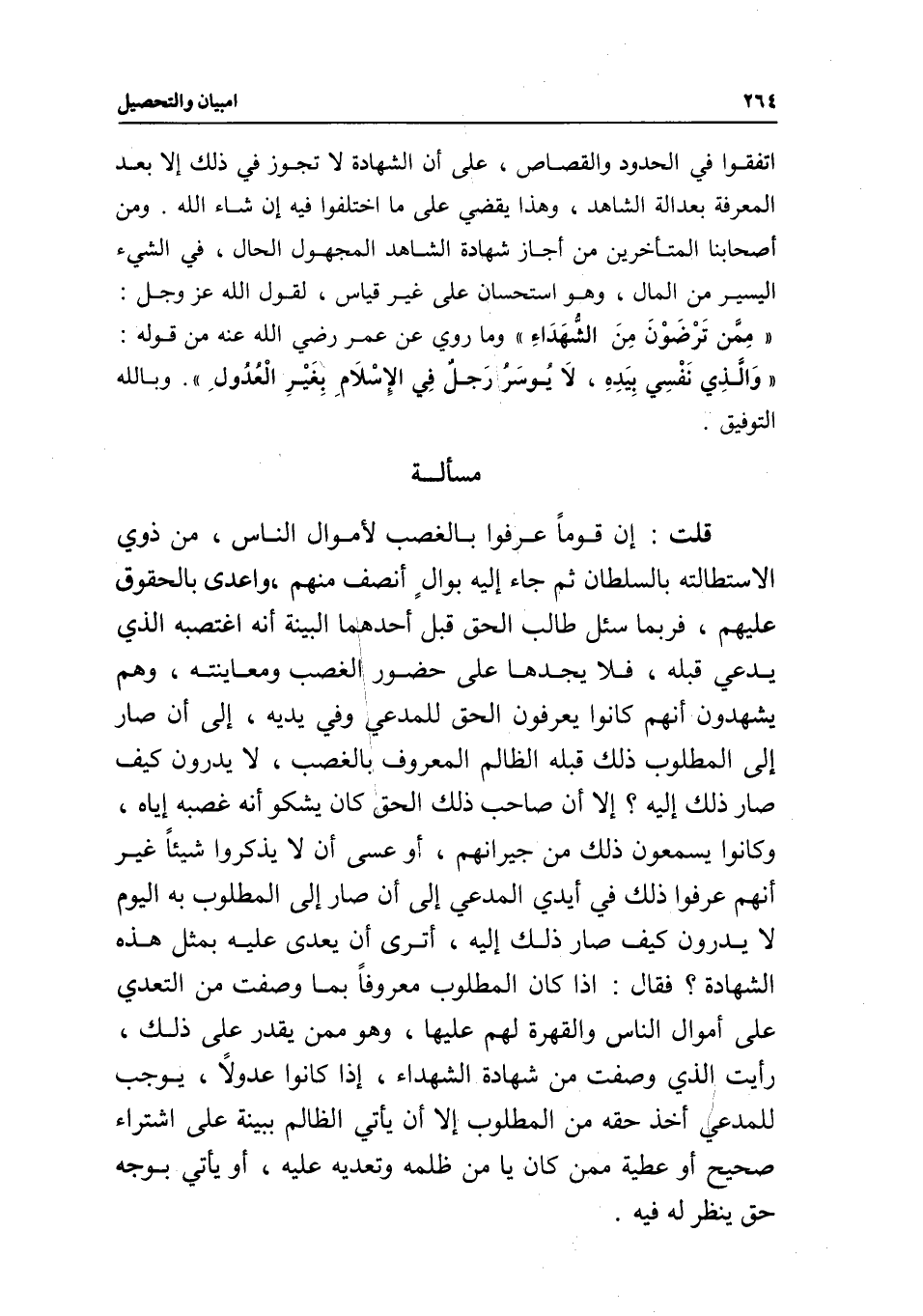 مسألة قلت: إن قوما عرفوا بالغصب لأموال الناس، من ذوي الاستطالة بالسلطان ثم جاء إليه بوال أنصف منهم، وأعدى بالحقوق عليهم، فربما سئل طالب الحق قبل أحدهما البينة أنه اغتصبه الذي يدعي قبله، فلا يجدها على حضور الغصب ومعاينته، وهم يشهدون أنهم كانوا يعرفون الحق للمدعي وفي يديه، إلى أن صار إلى المطلوب ذلك قبله الظالم المعروف بالغصب، لا يدرون كيف صار ذلك إليه؟ إلا أن صاحب ذلك الحق كان يشكو أنه غصبه إياه، وكانوا يسمعون ذلك من جيرانهم، أو عسى أن لا يذكروا شيئا غير أنهم عرفوا ذلك في أيدي المدعي إلى أن صار إلى المطلوب به اليوم لا يدرون كيف صار ذلك إليه، أترى أن يعدى عليه بمثل هذه الشهادة؟ فقال: إذا كان المطلوب معروفا بما وصفت من التعدي على أموال الناس والقهرة لهم عليها، وهو ممن يقدر على ذلك، رأيت الذي وصفت من شهادة الشهداء، إذا كانوا عدولا، يوجب للمدعي أخذ حقه من المطلوب إلا أن يأتي الظالم ببينة على اشتراء صحيح أو عطية ممن كان يا من ظلمه وتعديه عليه، أو يأتي بوجه حق ينظر له فيه.