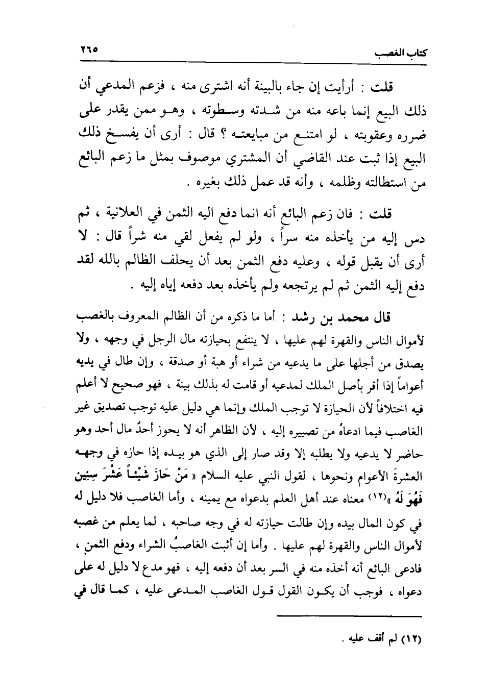 قال محمد بن رشد: أما ما ذكره من أن الظالم المعروف بالغصب لأموال الناس والقهرة لهم عليها، لا ينتفع بحيازته مال الرجل في وجهه، ولا يصدق من أجلها على ما يدعيه من شراء أو هبة أو صدقة، وإن طال في يديه أعواما إذا أقر بأصل الملك لمدعيه أو قامت له بذلك بينة، فهو صحيح لا أعلم فيه اختلافا؛ لأن الحيازة لا توجب الملك وإنما هي دليل عليه توجب تصديق غير الغاصب فيما ادعاه من تصييره إليه؛ لأن الظاهر أنه لا يحوز أخذ مال أحد وهو حاضر لا يدعيه ولا يطلبه إلا وقد صار إلى الذي هو بيده إذا حازه في وجهه العشرة الأعوام ونحوها، لقول النبي - عَلَيْهِ السَّلَامُ - «من حاز شيئا عشر سنين فهو له» معناه عند أهل العلم بدعواه مع يمينه، وأما الغاصب فلا دليل له في كون المال بيده وإن طالت حيازته له في وجه صاحبه، لما يعلم من غصبه لأموال الناس والقهرة لهم عليها. وأما إن أثبت الغاصب الشراء ودفع الثمني، فادعى البائع أنه أخذه منه في السر بعد أن دفعه إليه، فهو مدع لا دليل له على دعواه، فوجب أن يكون القول قول الغاصب المدعى عليه، كما قال في