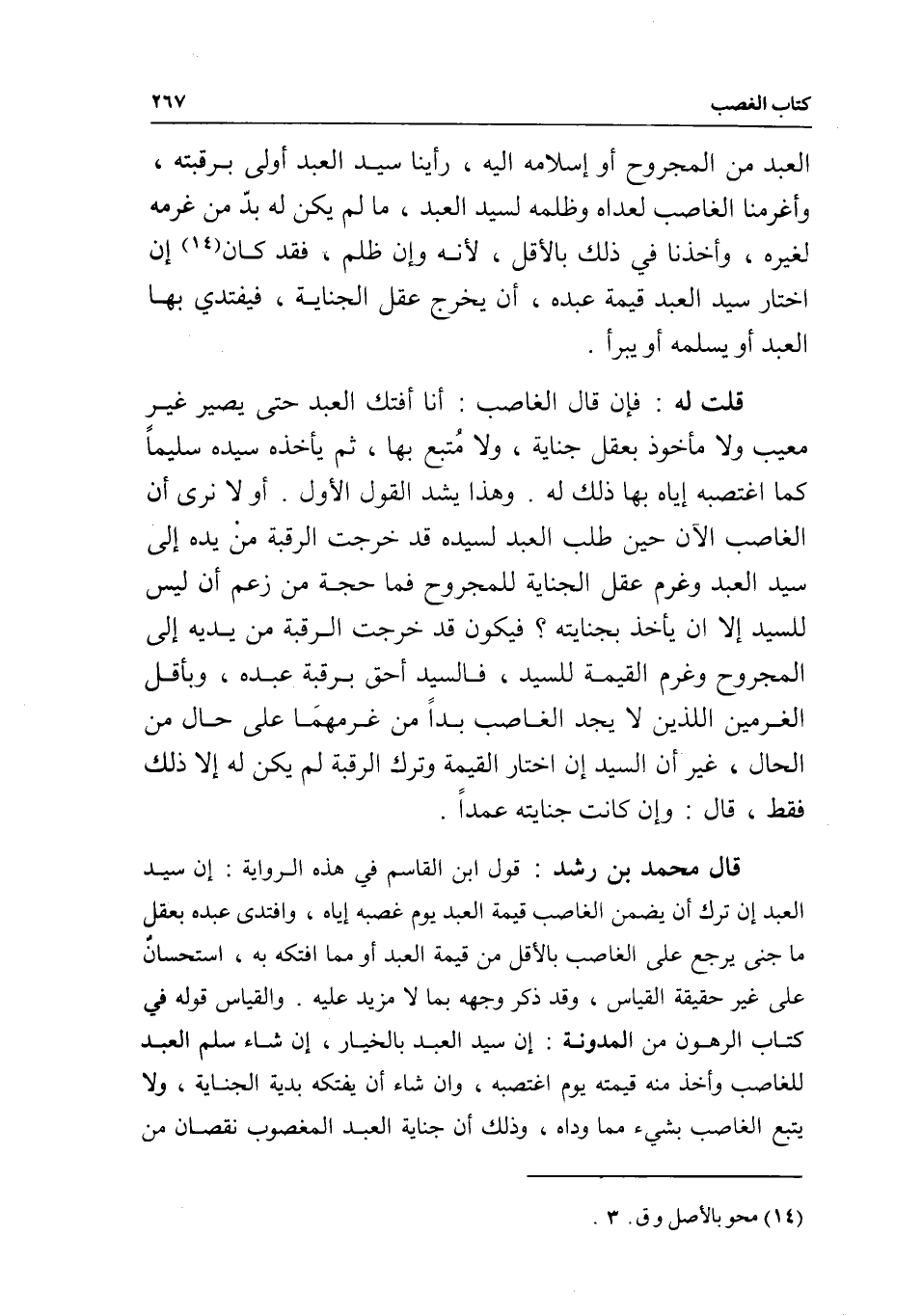 قلت له: فإن قال الغاصب: أنا أفتك العبد حتى يصير غير معيب ولا مأخوذ بعقل جناية، ولا متبع بها، ثم يأخذه سيده سليما كما اغتصبه إياه بها ذلك له. وهذا يشد القول الأول. أو لا نرى أن الغاصب الآن حين طلب العبد لسيده قد خرجت الرقبة من يده إلى سيد العبد وغرم عقل الجناية للمجروح فما حجة من زعم أن ليس للسيد إلا أن يأخذ بجنايته؟ فيكون قد خرجت الرقبة من يديه إلى المجروح وغرم القيمة للسيد، فالسيد أحق برقبة عبده، وبأقل الغرمين اللذين لا يجد الغاصب بدا من غرمهما على حال من الحال، غير أن السيد إن اختار القيمة وترك الرقبة لم يكن له إلا ذلك فقط، قال: وإن كانت جنايته عمدا.
