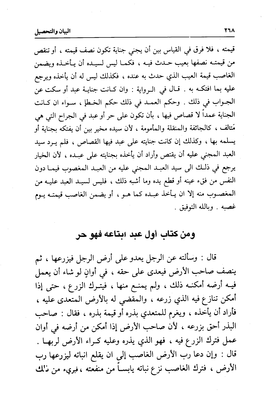 ومن كتاب أول عبد أبتاعه فهو حر قال: وسألته عن الرجل يعدو على أرض الرجل فيزرعها، ثم ينصف صاحب الأرض فيعدى على حقه، في أوان لو شاء أن يعمل فيه أرضه أمكنه ذلك، ولم يمنع منها، فيترك الزرع، حتى إذا أمكن تنازع فيه الذي زرعه، والمقضي له بالأرض المتعدى عليه، فأراد أن يأخذه، ويغرم للمتعدي بذره أو قيمة بذره، فقال: صاحب البذر أحق بزرعه؛ لأن صاحب الأرض إذا أمكن من أرضه في أوان عمل فترك الزرع فيه، فهو الذي بذره وعليه كراء الأرض لربها.
