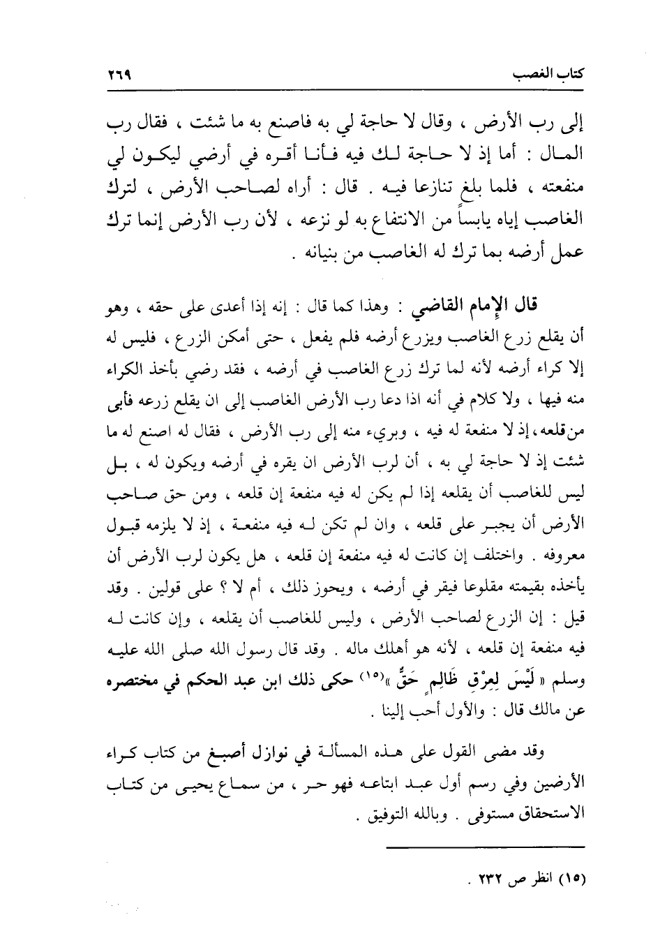 إلى رب الأرض، وقال: لا حاجة لي به فاصنع به ما شئت، فقال رب المال: أما إذ لا حاجة لك فيه فأنا أقره في أرضي ليكون لي منفعته، فلما بلغ تنازعا فيه. قال: أراه لصاحب الأرض؛ لترك الغاصب إياه يابسا من الانتفاع به لو نزعه؛ لأن رب الأرض إنما ترك عمل أرضه بما ترك له الغاصب من بنيانه.