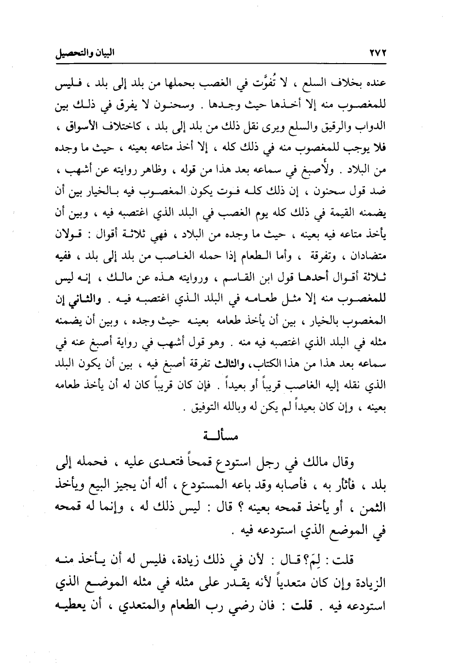 عنده بخلاف السلع، لا تفوت في الغصب بحملها من بلد إلى بلد، فليس للمغصوب منه إلا أخذها حيث وجدها. وسحنون لا يفرق في ذلك بين الدواب والرقيق والسلع، ويرى نقل ذلك من بلد إلى بلد، كاختلاف الأسواق، فلا يوجب للمغصوب منه في ذلك كله، إلا أخذ متاعه بعينه، حيث ما وجده من البلاد. ولأصبغ في سماعه بعد هذا من قوله، وظاهر روايته عن أشهب، ضد قول سحنون، إن ذلك كله فوت يكون المغصوب فيه بالخيار بين أن يضمنه القيمة في ذلك كله يوم الغصب في البلد الذي اغتصبه فيه، وبين أن يأخذ متاعه فيه بعينه، حيث ما وجده من البلاد، فهي ثلاثة أقوال: قولان متضادان، وتفرقة، وأما الطعام إذا حمله الغاصب من بلد إلى بلد، ففيه ثلاثة أقوال أحدها قول ابن القاسم، وروايته هذه عن مالك، إنه ليس للمغصوب منه إلا مثل طعامه في البلد الذي اغتصبه فيه. والثاني: إن المغصوب بالخيار، بين أن يأخذ طعامه بعينه حيث وجده، وبين أن يضمنه مثله في البلد الذي اغتصبه فيه منه. وهو قول أشهب في رواية أصبغ عنه في سماعه بعد هذا من هذا الكتاب، والثالث تفرقة أصبغ فيه، بين أن يكون البلد الذي نقله إليه الغاصب قريبا أو بعيدا. فإن كان قريبا كان له أن يأخذ طعامه بعينه، وإن كان بعيدا لم يكن له وبالله التوفيق.