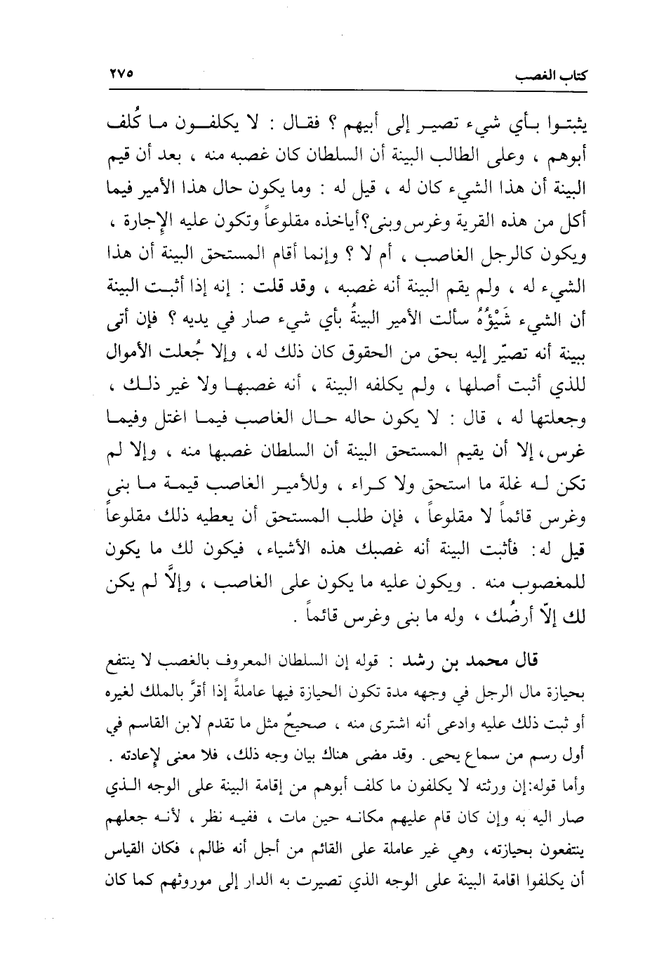 يثبتوا بأي شيء تصير إلى أبيهم؟ فقال: لا يكلفون ما كلف أبوهم، وعلى الطالب البينة أن السلطان كان غصبه منه، بعد أن قيم البينة أن هذا الشيء كان له، قيل له: وما يكون حال هذا الأمير فيما أكل من هذه القرية وغرس وبنى؟ أيأخذه مقلوعا وتكون عليه الإجارة، ويكون كالرجل الغاصب، أم لا؟ وإنما أقام المستحق البينة أن هذا الشيء له، ولم يقم البينة أنه غصبه، وقد قلت: إنه إذا أثبت البينة أن الشيء شيئه سألت الأمير البينة بأي شيء صار في يديه؟ فإن أتى ببينة أنه تصير إليه بحق من الحقوق كان ذلك له، وإلا جعلت الأموال للذي أثبت أصلها، ولم يكلفه البينة، أنه غصبها ولا غير ذلك، وجعلتها له، قال: لا يكون حاله حال الغاصب فيما اغتل وفيما غرس، إلا أن يقيم المستحق البينة أن السلطان غصبها منه، وإلا لم تكن له غلة ما استحق ولا كراء، وللأمير الغاصب قيمة ما بنى وغرس قائما لا مقلوعا، فإن طلب المستحق أن يعطيه ذلك مقلوعا قيل له: فأثبت البينة أنه غصبك هذه الأشياء، فيكون لك ما يكون للمغصوب منه. ويكون عليه ما يكون على الغاصب، وإلا لم يكن لك إلا أرضك، وله ما بنى وغرس قائما.