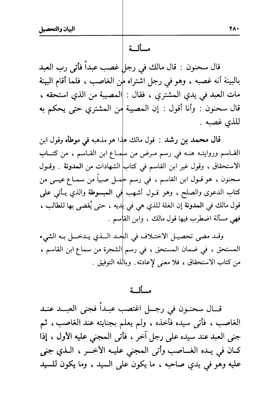 قال محمد بن رشد: قول مالك هذا هو مذهبه في موطئه وقول ابن القاسم وروايته عنه في رسم مرض من سماع ابن القاسم، من كتاب الاستحقاق، وقول غير ابن القاسم في كتاب الشهادات من المدونة. وقول سحنون، هو قول ابن القاسم، في رسم حمل صبيا من سماع عيسى من كتاب الدعوى والصلح، وهو قول أشهب في المبسوطة والذي يأتي على قول مالك في المدونة: إن الغلة للذي هي في يديه، حتى يقضى بها للطالب، فهي مسألة اضطرب فيها قول مالك، وابن القاسم.