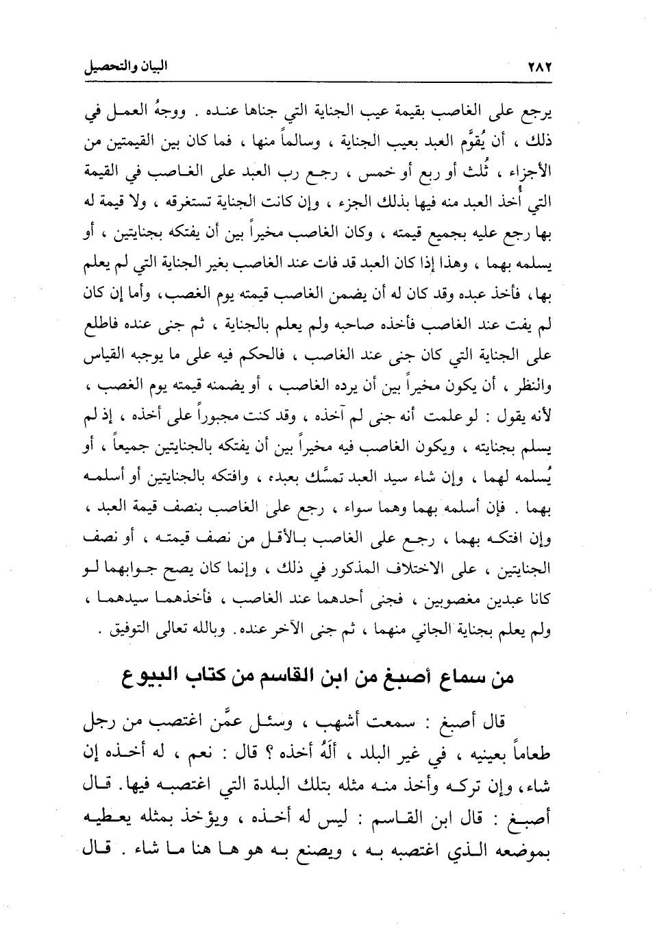 من سماع أصبغ من ابن القاسم من كتاب البيوع قال أصبغ: سمعت أشهب، وسئل عمن اغتصب من رجل طعاما بعينيه، في غير البلد، أله أخذه؟ قال: نعم، له أخذه إن شاء، وإن تركه وأخذ منه مثله بتلك البلدة التي اغتصبه فيها. قال أصبغ: قال ابن القاسم: ليس له أخذه، ويؤخذ بمثله يعطيه بموضعه الذي اغتصبه به، ويصنع به هو ها هنا ما شاء. قال