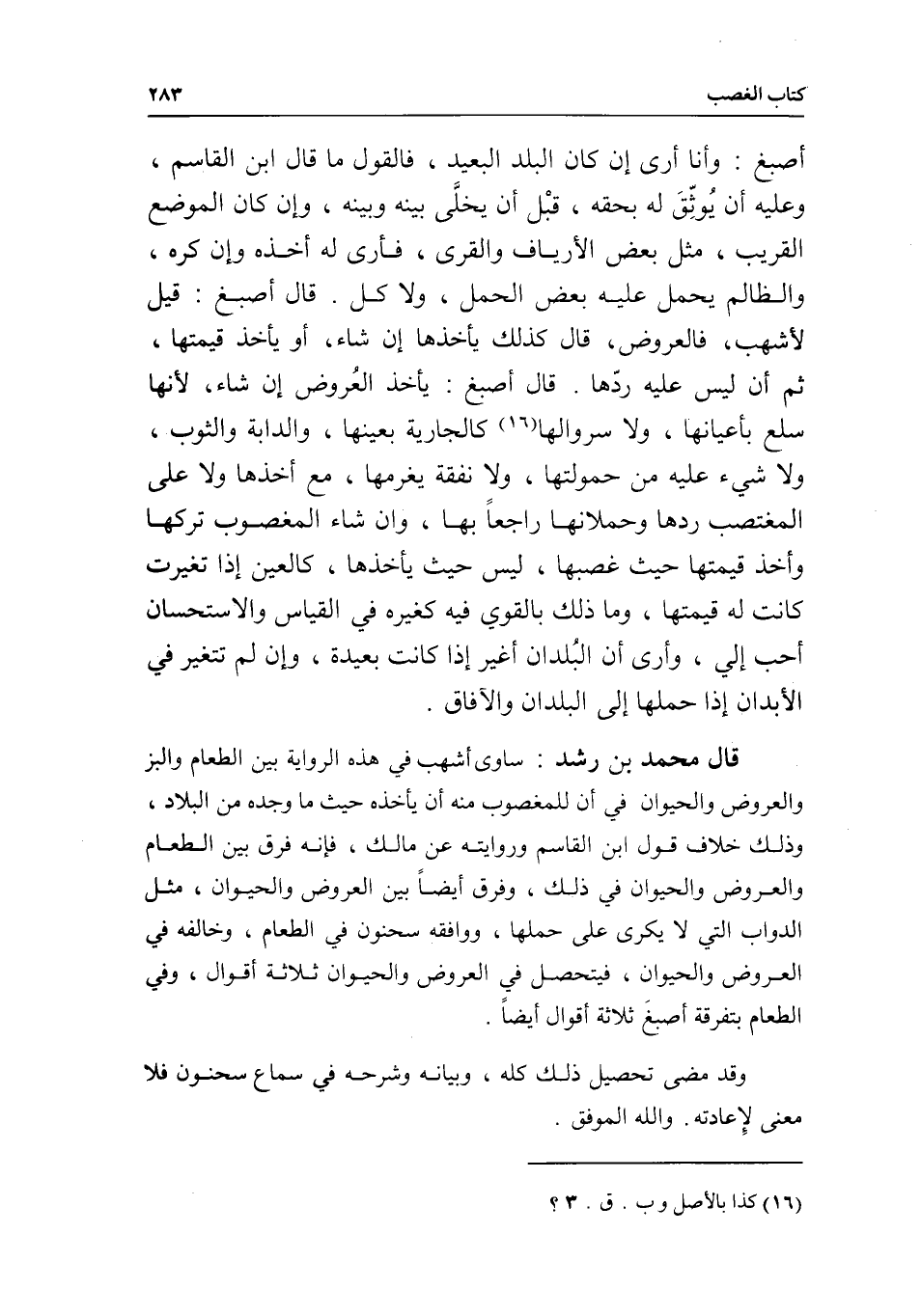 قال محمد بن رشد: ساوى أشهب في هذه الرواية بين الطعام والبز والعروض والحيوان في أن للمغصوب منه أن يأخذه حيث ما وجده من البلاد، وذلك خلاف قول ابن القاسم وروايته عن مالك، فإنه فرق بين الطعام والعروض والحيوان في ذلك، وفرق أيضا بين العروض والحيوان، مثل الدواب التي لا يكرى على حملها، ووافقه سحنون في الطعام، وخالفه في العروض والحيوان، فيتحصل في العروض والحيوان ثلاثة أقوال، وفي الطعام بتفرقة أصبغ ثلاثة أقوال أيضا.