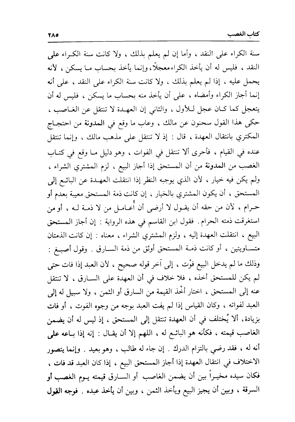 سنة الكراء على النقد، وأما إن لم يعلم بذلك، ولا كانت سنة الكراء على النقد، فليس له أن يأخذ الكراء معجلا، وإنما يأخذ بحساب ما يسكن؛ لأنه يحملك عليه، إذا لم يعلم بذلك، ولا كانت سنة الكراء على النقد، على أنه إنما أجاز الكراء وأمضاه، على أن يأخذ منه بحساب ما يسكن، فليس له أن يتعجل كما كان عجل للأول، والثاني: إن العهدة لا تنتقل عن الغاصب، حكى هذا القول سحنون عن مالك، وعاب ما وقع في المدونة من احتجاج المكتري بانتقال العهدة، قال: إذ لا تنتقل على مذهب مالك، وإنما تنتقل عنده في القيام، فأحرى ألا تنتقل في الفوات، وهو دليل ما وقع في كتاب الغصب من المدونة من أن المستحق إذا أجاز البيع، لزم المشتري الشراء، ولم يكن فيه خيار؛ لأن الذي يوجبه النظر إذا انتقلت العهدة عن البائع إلى المستحق، أن يكون المشتري بالخيار، إن كانت ذمة المستحق معيبة بعدم أو حرام؛ لأن من حقه أن يقول لا أرضى أن أعامل من لا ذمة له، أو من استغرقت ذمته الحرام. فقول ابن القاسم في هذه الرواية: إن أجاز المستحق البيع، انتقلت العهدة إليه، ولزم المشتري الشراء، معناه: إن كانت الذمتان متساويتين، أو كانت ذمة المستحق أوثق من ذمة السارق. وقول أصبغ: وذلك ما لم يدخل البيع فوت، إلى آخر قوله صحيح؛ لأن العبد إذا فات حتى لم يكن للمستحق أخذه، فلا خلاف في أن العهدة على السارق، لا تنتقل عنه إلى المستحق، اختار أخذ القيمة من السارق أو الثمن، ولا سبيل له إلى العبد لفواته، وكان القياس إذا لم يفت العبد بوجه من وجوه الفوت، أو فات بزيادة، ألا يختلف في أن العهدة تنتقل إلى المستحق، إذ ليس له أن يضمن الغاصب قيمته، فكأنه هو البائع له، اللهم إلا أن يقال: إنه إذا باعه على أنه له، فقد رضي بالتزام الدرك. إن جاء له طالب، وهو بعيد. وإنما يتصور الاختلاف في انتقال العهدة إذا أجاز المستحق البيع، إذا كان العبد قد فات، فكان سيده مخيرا بين أن يضمن الغاصب أو السارق قيمته يوم الغصب أو السرقة، وبين أن يجيز البيع ويأخذ الثمن، وبين أن يأخذ عبده. فوجه القول