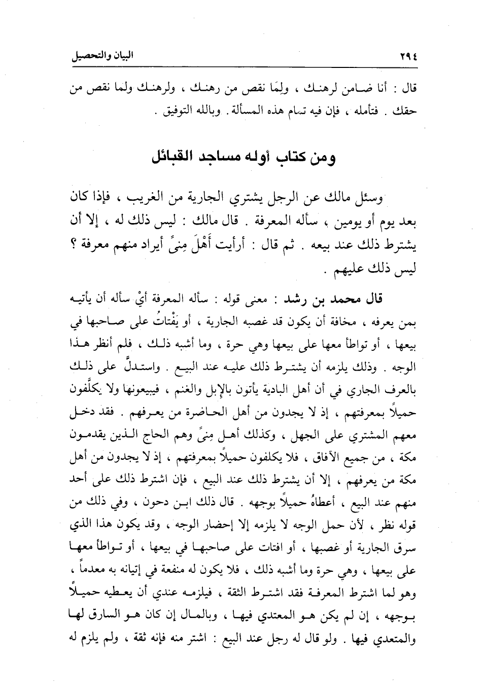قال محمد بن رشد: معنى قوله: سأله المعرفة أي سأله أن يأتيه بمن يعرفه، مخافة أن يكون قد غصبه الجارية، أو يفتات على صاحبها في بيعها، أو تواطأ معها على بيعها وهي حرة، وما أشبه ذلك، فلم أنظر هذا الوجه. وذلك يلزمه أن يشترط ذلك عليه عند البيع. واستدل على ذلك بالعرف الجاري في أن أهل البادية يأتون بالإبل والغنم، فيبيعونها ولا يكلفون حميلا بمعرفتهم، إذ لا يجدون من أهل الحاضرة من يعرفهم. فقد دخل معهم المشتري على الجهل، وكذلك أهل منى وهم الحاج الذين يقدمون مكة؛ من جميع الآفاق، فلا يكلفون حميلا بمعرفتهم، إذ لا يجدون من أهل مكة من يعرفهم، إلا أن يشترط ذلك عند البيع، فإن اشترط ذلك على أحد منهم عند البيع، أعطاه حميلا بوجهه. قال ذلك ابن دحون، وفي ذلك من قوله نظر؛ لأن حمل الوجه لا يلزمه إلا إحضار الوجه، وقد يكون هذا الذي سرق الجارية أو غصبها، أو افتات على صاحبها في بيعها، أو تواطأ معها على بيعها، وهي حرة وما أشبه ذلك، فلا يكون له منفعة في إتيانه به معدما، وهو لما اشترط المعرفة فقد اشترط الثقة، فيلزمه عندي أن يعطيه حميلا بوجهه، إن لم يكن هو المعتدي فيها، وبالمال إن كان هو السارق لها والمتعدي فيها.. ولو قال له رجل عند البيع: اشتر منه فإنه ثقة، ولم يلزم له