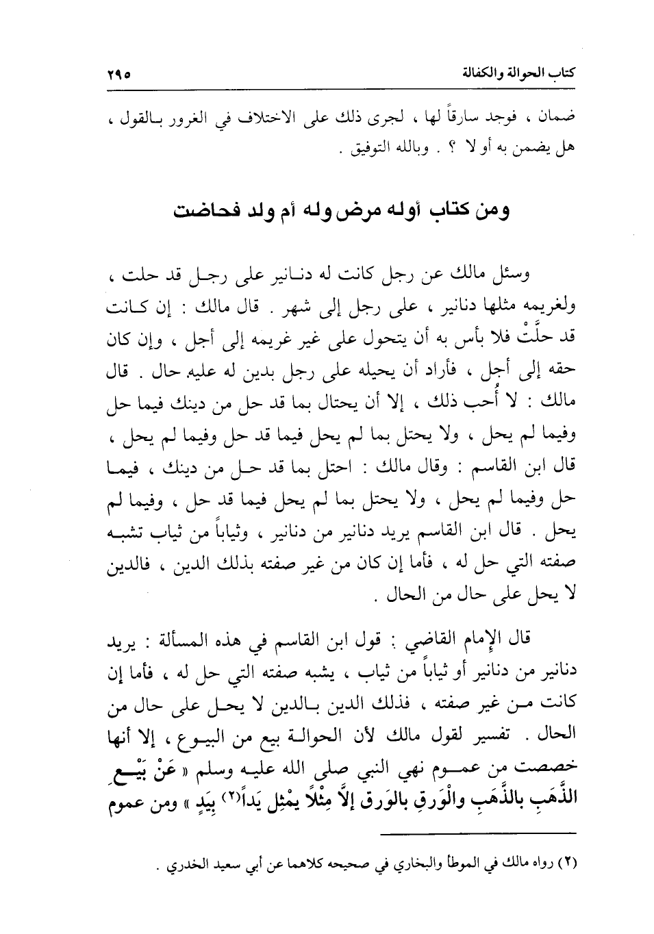 قال الإمام القاضي؟ قول ابن القاسم في هذه المسألة: يريد دنانير من دنانير أو ثيابا من ثياب.، تشبه صفته التي حل له، فأما إن كانت من غير صفته، فذلك الدين بالدين لا يحل على حال من الحال. تفسير لقول مالك لأن الحوالة بيع من البيوع، إلا أنها خصصت من عموم «نهي النبي - صَلَّى اللَّهُ عَلَيْهِ وَسَلَّمَ - "عن بيع الذهب بالذهب والورق بالورق إلا مثلا بمثل يدا بيد» ومن عموم