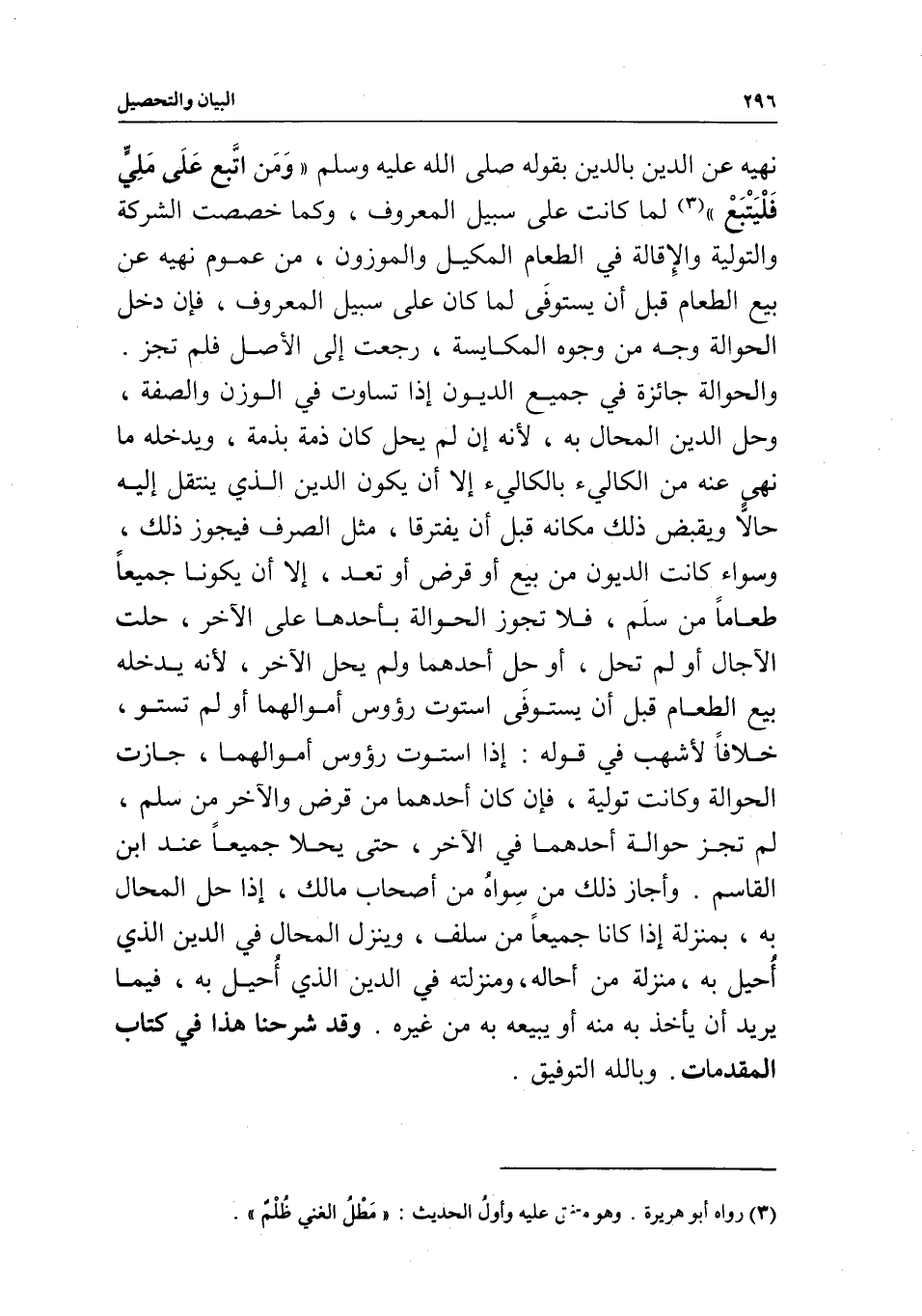 نهيه عن الدين بالدين بقوله - صَلَّى اللَّهُ عَلَيْهِ وَسَلَّمَ - «ومن اتبع على ملي فليتبع» لما كانت على سبيل المعروف، وكما خصصت الشركة والتولية والإقالة في الطعام المكيل والموزون، من عموم نهيه عن بيع الطعام قبل أن يستوفى لما كان على سبيل المعروف، فإن دخل الحوالة وجه من وجوه المكايسة، رجعت إلى الأصل فلم تجز. والحوالة جائزة في جميع الديون إذا تساوت في الوزن والصفة، وحل الدين المحال به؛ لأنه إن لم يحل كان ذمة بذمة، ويدخله ما نهى عنه من الكالئ بالكالئ، إلا أن يكون الدين الذي ينتقل إليه حالا، ويقبض ذلك مكانه قبل أن يفترقا، مثل الصرف فيجوز ذلك، وسواء كانت الديون من بيع أو قرض أو تعد، إلا أن يكونا جميعا طعاما من سلم، فلا تجوز الحوالة بأحدها على الآخر، حلت الآجال أو لم تحل، أو حل أحدهما ولم يحل الآخر؛ لأنه يدخله بيع الطعام قبل أن يستوفى استوت رؤوس أموالهما أو لم تستو، خلافا لأشهب في قوله: إذا استوت رؤوس أموالهما، جازت الحوالة وكانت تولية، فإن كان أحدهما من قرض والآخر من سلم، لم تجز حوالة أحدهما في الآخر، حتى يحلا جميعا عند ابن القاسم. وأجاز ذلك من سواه من أصحاب مالك، إذا حل المحال به، بمنزلة إذا كانا جميعا من سلف، وينزل المحال في الدين الذي أحيل به، منزلة من أحاله، ومنزلته في الدين الذي أحيل به، فيما يريد أن يأخذ به منه أو يبيعه به من غيره. وقد شرحنا هذا في كتاب المقدمات. وبالله التوفيق.