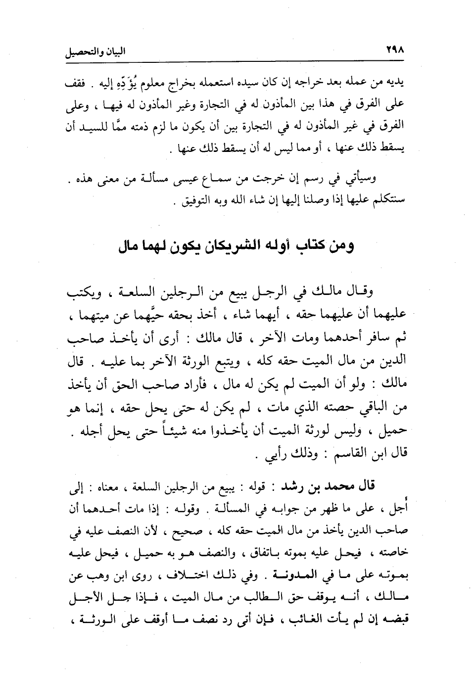 قال محمد بن رشد: قوله: يبيع من الرجلين السلعة، معناه: إلى أجل، على ما ظهر من جوابه في المسألة. وقوله: إذا مات أحدهما أن صاحب الدين يأخذ من مال الميت حقه كله، صحيح؛ لأن النصف عليه في خاصته، فيحل عليه بموته باتفاق، والنصف هو به حميل، فيحل عليه بموته على ما في المدونة. وفي ذلك اختلاف، روى ابن وهب عن مالك، أنه يوقف حق الطالب من مال الميت، فإذا حل الأجل قبضه إن لم يأت الغائب، فإن أتى رد نصف ما أوقف على الورثة،
