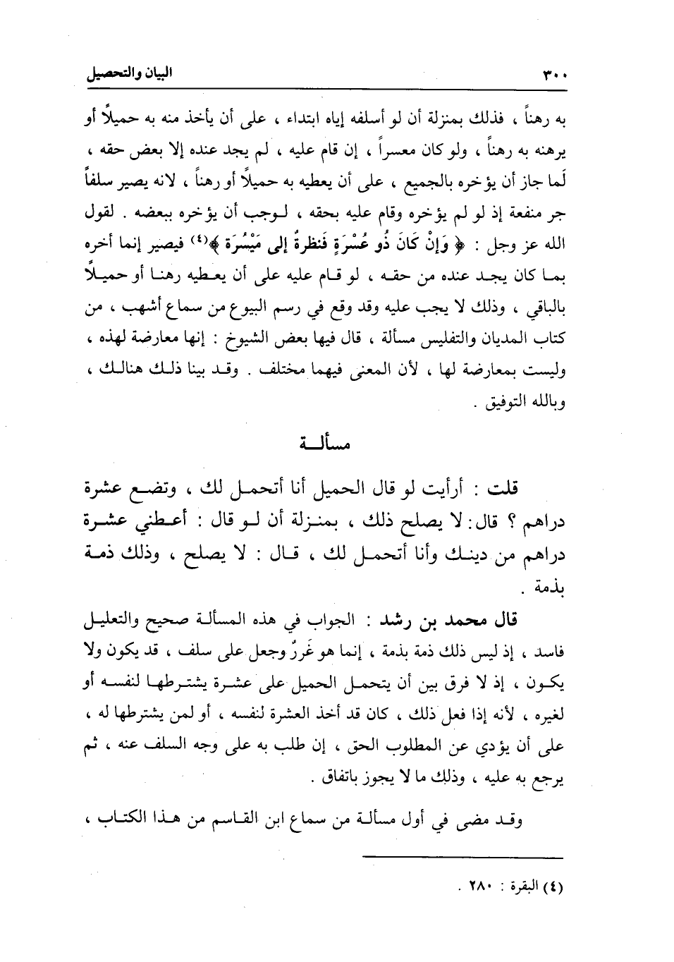 به رهنا، فذلك بمنزلة أن لو أسلفه إياه ابتداء، على أن يأخذ منه به حميلا أو يرهنه به رهنا، ولو كان معسرا، إن قام عليه، لم يجد عنده إلا بعض حقه، لما جاز أن يؤخره بالجميع، على أن يعطيه به حميلا أو رهنا؛ لأنه يصير سلفا جر منفعة، إذ لو لم يؤخره وقام عليه بحقه، لوجب أن يؤخره ببعضه؛ لقول الله عز وجل: {وَإِنْ كَانَ ذُو عُسْرَةٍ فَنَظِرَةٌ إِلَى مَيْسَرَةٍ} [البقرة: 280] فيصير إنما أخره بما كان يجد عنده من حقه، لو قام عليه على أن يعطيه رهنا أو حميلا بالباقي، وذلك لا يجب عليه، وقد وقع في رسم البيوع من سماع أشهب، من كتاب المديان والتفليس، مسألة قال فيها بعض الشيوخ: إنها معارضة لهذه، وليست بمعارضة لها؛ لأن المعنى فيهما مختلف. وقد بينا ذلك هنالك، وبالله التوفيق.