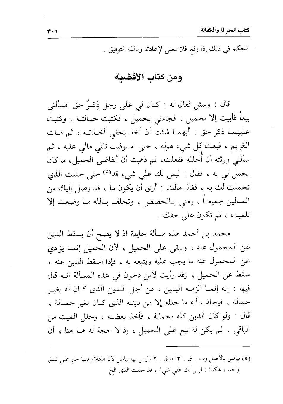 ومن كتاب الأقضية قال: وسئل فقال له: كان لي على رجل ذكر حق فسألني بيعا فأبيت إلا بحميل، فجاءني بحميل، فكتبت حمالته، وكتبت عليهما ذكر حق، أيهما شئت أن آخذ بحقي أخذته، ثم مات الغريم، فبعت كل شيء هو له، حتى استوفيت ثلثي مالي عليه، ثم سألني ورثته أن أحلله ففعلت، ثم ذهبت أن أتقاضى الحميل، ما كان يحمل لي به، فقال: ليس لك علي شيء قد.... حتى حللت الذي تحملت لك به، فقال مالك: أرى أن يكون ما قد وصل إليك من المالين جميعا، يعني بالحصص، وتحلف بالله ما وضعت إلا للميت، ثم تكون على حقك.
