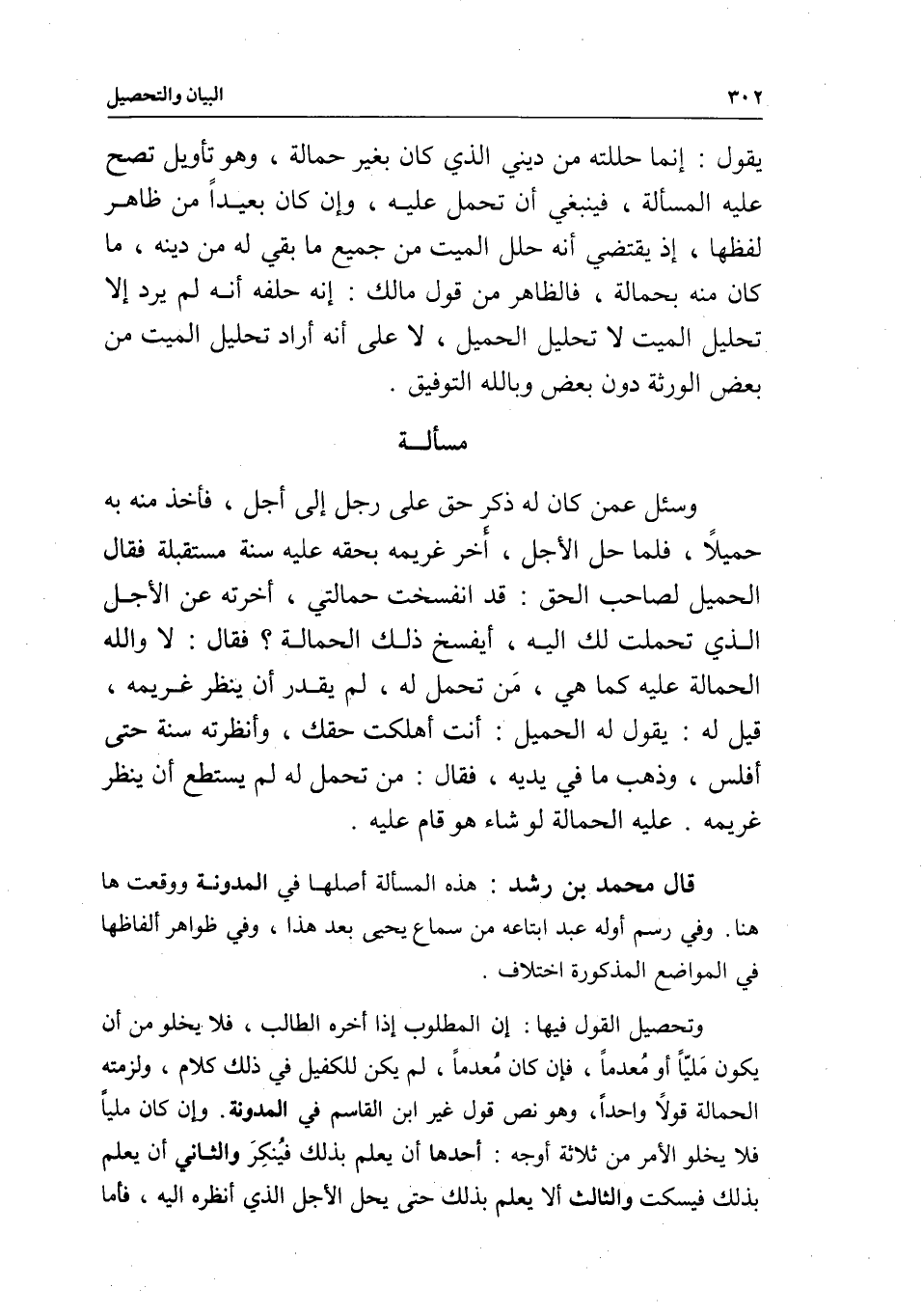 مسألة وسئل عمن كان له ذكر حق على رجل إلى أجل، فأخذ منه به حميلا، فلما حل الأجل، أخر غريمه بحقه عليه سنة مستقبلة فقال الحميل لصاحب الحق: قد انفسخت حمالتي، أخرته عن الأجل الذي تحملت لك إليه، أيفسخ ذلك الحمالة؟ فقال: لا والله الحمالة عليه كما هي، من تحمل له، لم يقدر أن ينظر غريمه، قيل له: يقول له الحميل: أنت أهلكت حقك، وأنظرته سنة حتى أفلس، وذهب ما في يديه، فقال: من تحمل له لم يستطع أن ينظر غريمه عليه الحمالة لو شاء هو قام عليه.