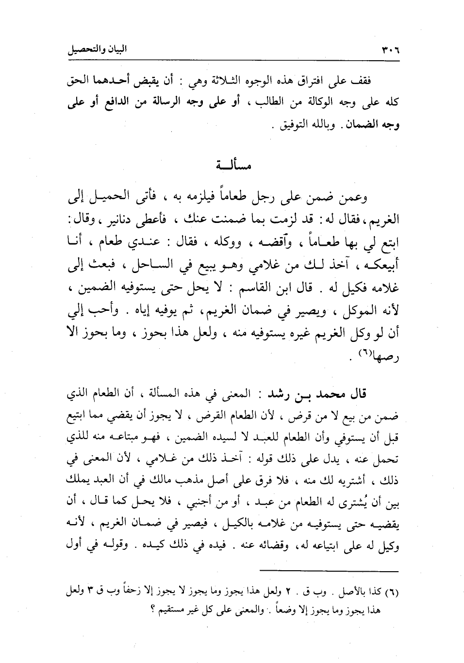 قال محمد بن رشد: المعنى في هذه المسألة، أن الطعام الذي ضمن من بيع لا من قرض؛ لأن الطعام القرض، لا يجوز أن يقضي مما ابتيع قبل أن يستوفي وأن الطعام للعبد لا لسيده الضمين، فهو مبتاعه منه للذي تحمل عنه، يدل على ذلك قوله: آخذ ذلك من غلامي؛ لأن المعنى في ذلك، أشتريه لك منه، فلا فرق على أصل مذهب مالك في أن العبد يملك بين أن يشترى له الطعام من عبد، أو من أجنبي، فلا يحل كما قال، أن يقضيه حتى يستوفيه من غلامه بالكيل، فيصير في ضمان الغريم؛ لأنه وكيل له على ابتياعه له، وقضائه عنه. فيده في ذلك كيده. وقوله في أول