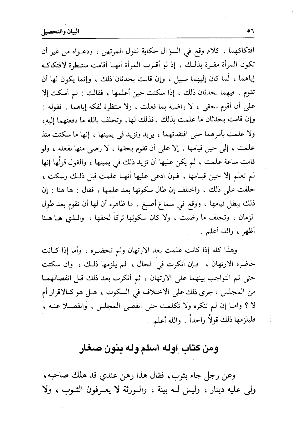افتكاكهما، كلام وقع في السؤال حكاية لقول المرتهن، ودعواه من غير أن تكون المرأة مقرة بذلك، إذ لو أقرت المرأة أنها أقامت منتظرة لافتكاكه إياهما، لما كان إليهما سبيل، وإن قامت بحدثان ذلك، وإنما يكون لها أن تقوم. فيهما بحدثان ذلك، إذا سكتت حين أعلمها، فقالت: لم أسكت إلا على أن أقوم بحقي، لا راضية بما فعلت، ولا منتظرة لفكه إياهما. فقوله: وإن قامت بحدثان ما علمت بذلك فذلك لها، وتحلف بالله ما دفعتهما إليه، ولا علمت بأمرهما حتى افتقدتهما، يريد وتزيد في يمينها، إنها ما سكتت منذ علمت، إلى حين قيامها، إلا على أن تقوم بحقها، لا رضي منها بفعله، ولو قامت ساعة علمت، لم يكن عليها أن تزيد ذلك في يمينها، والقول قولها إنها لم تعلم إلا حين قيامها، فإن ادعى عليها أنها علمت قبل ذلك وسكت، حلفت على ذلك، واختلف إن طال سكوتها بعد علمها، فقال: ها هنا: إن ذلك يبطل قيامها، ووقع في سماع أصبغ، ما ظاهره أن لها أن تقوم بعد طول الزمان، وتحلف ما رضيت، ولا كان سكوتها تركا لحقها، والذي ها هنا أظهر، والله أعلم.