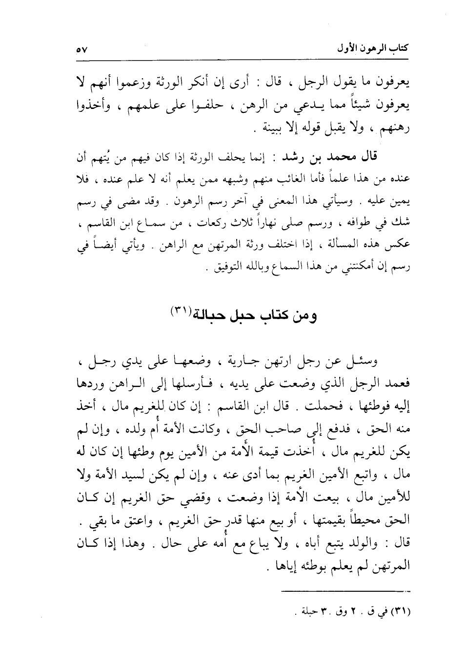 ومن كتاب حبل حبالة وسئل عن رجل ارتهن جارية، وضعها على يدي رجل، فعمد الرجل الذي وضعت على يديه، فأرسلها إلى الراهن وردها إليه فوطئها، فحملت. قال ابن القاسم: إن كان للغريم مال، أخذ منه الحق، فدفع إلى صاحب الحق، وكانت الأمة أم ولده، وإن لم يكن للغريم مال، أخذ قيمة الأمة من الأمين يوم وطئها إن كان له مال، واتبع الأمين الغريم بما أدى عنه، وإن لم يكن لسيد الأمة ولا للأمين مال، بيعت الأمة إذا وضعت، وقضي حق الغريم إن كان الحق محيطا بقيمتها، أو بيع منها قدر حق الغريم، واعتق ما بقي. قال: والولد يتبع أباه، ولا يباع مع أمه على حال. وهذا إذا كان المرتهن لم يعلم بوطئه إياها.