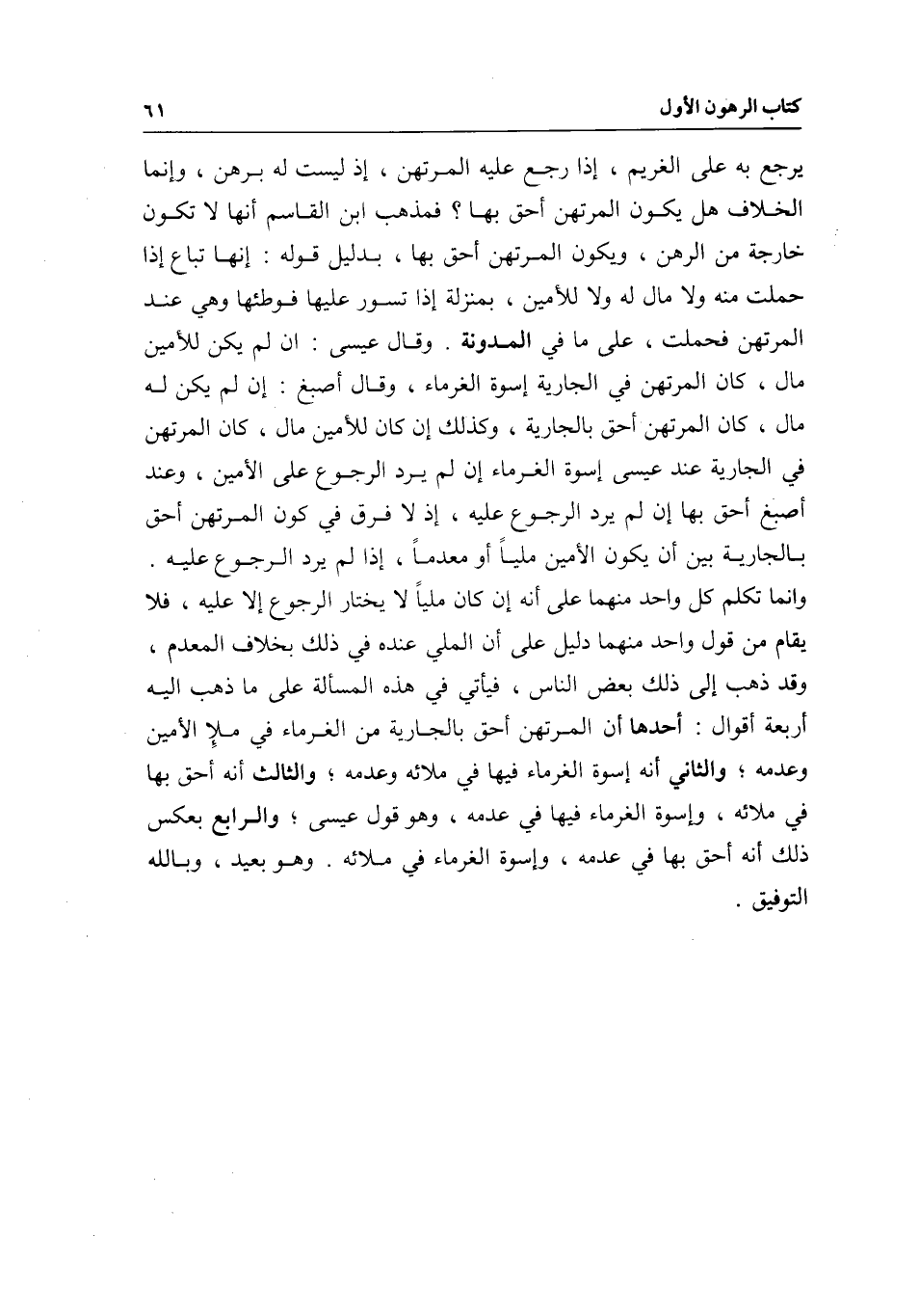 يرجع به على الغريم، إذا رجع عليه المرتهن، إذ ليست له برهن، وإنما الخلاف هل يكون المرتهن أحق بها؟ فمذهب ابن القاسم أنها لا تكون خارجة من الرهن، ويكون المرتهن أحق بها، بدليل قوله: إنها تباع إذا حملت منه ولا مال له ولا للأمين، بمنزلة إذا تسور عليها فوطئها وهي عند المرتهن فحملت، على ما في المدونة. وقال عيسى: إن لم يكن للأمين مال، كان المرتهن في الجارية إسوة الغرماء، وقال أصبغ: إن لم يكن له مال، كان المرتهن أحق بالجارية، وكذلك إن كان للأمين مال، كان المرتهن في الجارية عند عيسى إسوة الغرماء إن لم يرد الرجوع على الأمين، وعند أصبغ أحق بها إن لم يرد الرجوع عليه، إذ لا فرق في كون المرتهن أحق بالجارية بين أن يكون الأمين مليا أو معدما، إذا لم يرد الرجوع عليه. وإنما تكلم كل واحد منهما على أنه إن كان مليا لا يختار الرجوع إلا عليه، فلا يقام من قول واحد منهما دليل على أن الملي عنده في ذلك بخلاف المعدم، وقد ذهب إلى ذلك بعض الناس، فيأتي في هذه المسألة على ما ذهب إليه أربعة أقوال: أحدها أن المرتهن أحق بالجارية من الغرماء في ملإ الأمين وعدمه؟ والثاني أنه إسوة الغرماء فيها في ملائه وعدمه، والثالث أنه أحق بها في ملائه، وإسوة الغرماء فيها في عدمه، وهو قول عيسى؛ والرابع بعكس ذلك أنه أحق بها في عدمه، وإسوة الغرماء في ملائه. وهو بعيد، وبالله التوفيق.