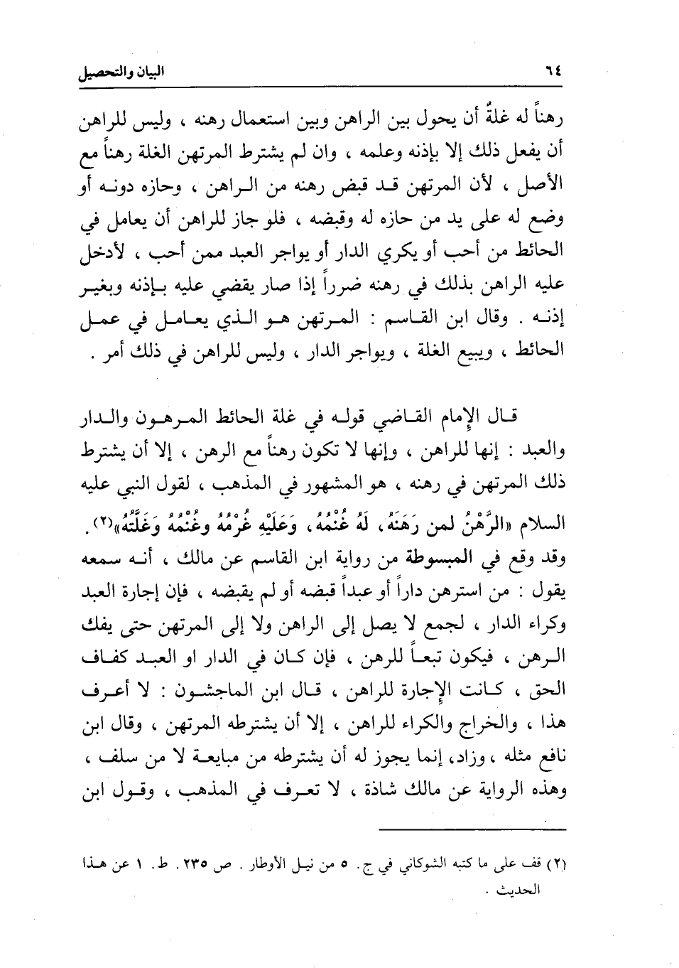 رهنا له غلة أن يحول بين الراهن وبين استعمال رهنه، وليس للراهن أن يفعل ذلك إلا بإذنه وعلمه، وإن لم يشترط المرتهن الغلة رهنا مع الأصل؛ لأن المرتهن قد قبض رهنه من الراهن، وحازه دونه أو وضع له على يد من حازه له وقبضه، فلو جاز للراهن أن يعامل في الحائط من أحب أو يكري الدار أو يؤاجر العبد ممن أحب، لأدخل عليه الراهن بذلك في رهنه ضررا إذ صار يقضي عليه بإذنه وبغير إذنه. وقال ابن القاسم: المرتهن هو الذي يعامل في عمل الحائط، ويبيع الغلة، ويؤاجر الدار، وليس للراهن في ذلك أمر.