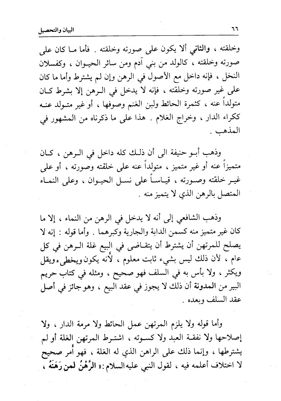 وخلقته، والثاني ألا يكون على صورته وخلقته. فأما ما كان على صورته وخلقته، كالولد من بني آدم ومن سائر الحيوان، وكفسلان النخل، فإنه داخل مع الأصول في الرهن وإن لم يشترط وأما ما كان على غير صورته وخلقته، فإنه لا يدخل في الرهن إلا بشرط، كان متولدا عنه، كثمرة الحائط ولبن الغنم وصوفها، أو غير متولد عنه ككراء الدار، وخراج الغلام. هذا على ما ذكرناه من المشهور في المذهب.