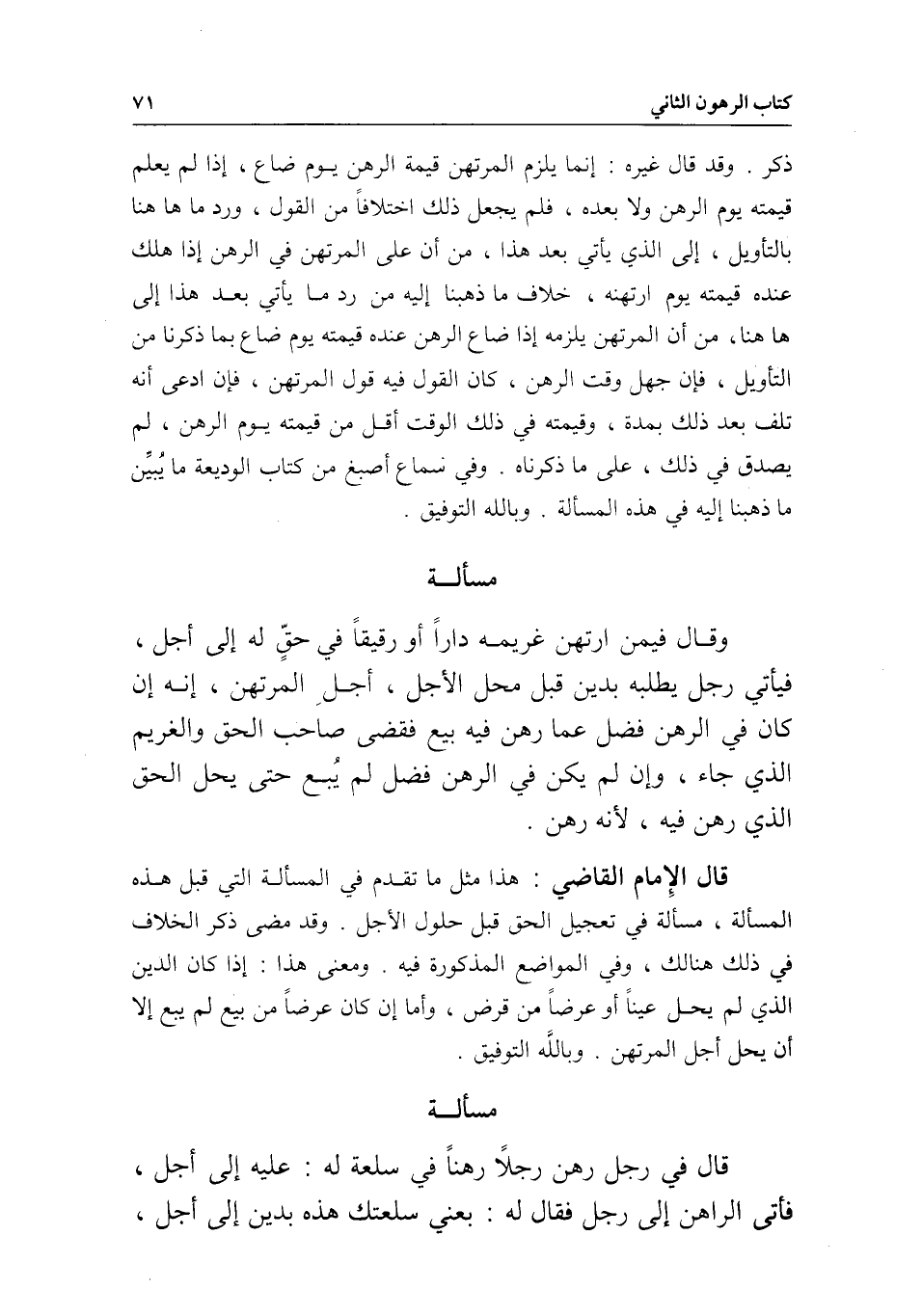 ذكر. وقد قال غيره: إنما يلزم المرتهن قيمة الرهن يوم ضاع، إذا لم يعلم قيمته يوم الرهن ولا بعده، فلم يجعل ذلك اختلافا من القول، ورد ما ها هنا بالتأويل، إلى الذي يأتي بعد هذا، من أن على المرتهن في الرهن إذا هلك عنده قيمته يوم ارتهنه، خلاف ما ذهبنا إليه من رد ما يأتي بعد هذا إلى ها هنا، من أن المرتهن يلزمه إذا ضاع الرهن عنده قيمته يوم ضاع بما ذكرنا من التأويل، فإن جهل وقت الرهن، كان القول فيه قول المرتهن، فإن ادعى أنه تلف بعد ذلك بمدة، وقيمته في ذلك الوقت أقل من قيمته يوم الرهن، لم يصدق في ذلك، على ما ذكرناه. وفي سماع أصبغ من كتاب الوديعة ما يبين ما ذهبنا إليه في هذه المسألة. وبالله التوفيق.