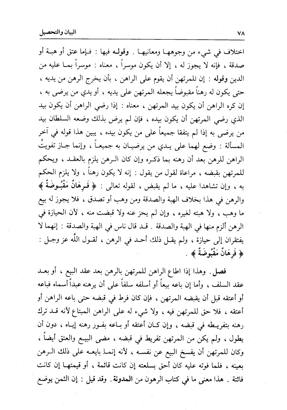 اختلاف في شيء من وجوهها ومعانيها. وقوله فيها: فإما عتق أو هبة أو صدقة، فإنه لا يجوز له، إلا أن يكون موسرا، معناه: موسرا بما عليه من الدين وقوله: إن للمرتهن أن يقوم على الراهن، بأن يخرج الرهن من يديه، حتى يكون له رهنا مقبوضا يجعله المرتهن على يديه، أو يدي من يرضى به، إن كره الراهن أن يكون بيد المرتهن، معناه: إذا رضي الراهن أن يكون بيد الذي رضي المرتهن أن يكون بيده، فإن لم يرض بذلك وضعه السلطان بيد من يرضى به إذا لم يتفقا جميعا على من يكون بيده، يبين هذا قوله في آخر المسألة: وضع لهما على يدي من يرضيان به جميعا، وإنما جاز تفويت الراهن للرهن بعد أن رهنه بما ذكره وإن كان الرهن يلزم بالعقد، ويحكم للمرتهن بقبضه، مراعاة لقول من يقول: إنه لا يكون رهنا، ولا يلزم الحكم به، وإن تشاهدا عليه، ما لم يقبض، لِقَوْلِهِ تَعَالَى: {فَرِهَانٌ مَقْبُوضَةٌ} [البقرة: 283] والرهن في هذا بخلاف الهبة والصدقة ومن وهب أو تصدق، فلا يجوز له بيع ما وهب، ولا هبته لغيره، وإن لم يحز عنه ولا قبضت منه؛ لأن الحيازة في الرهن ألزم منها في الهبة والصدقة. قد قال ناس في الهبة والصدقة: إنهما لا يفتقران إلى حيازة، ولم يقل ذلك، أحد في الرهن، لقول الله عز وجل: {فَرِهَانٌ مَقْبُوضَةٌ} [البقرة: 283] .
