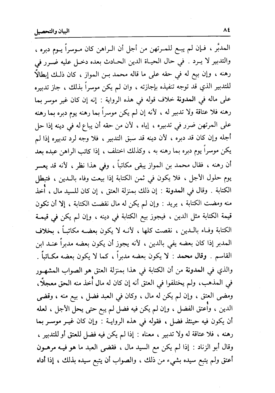 المدبر، فإن لم يبع للمرتهن من أجل أن الراهن كان موسرا يوم دبره، والتدبير لا يرد. في حال الحياة الدين الحادث بعده دخل عليه ضرر في رهنه، وإن بيع له في رهنه على ما قاله محمد بن المواز، كان ذلك إبطالا للتدبير الذي قد توجه تنفيذه بإجازته، وإن لم يكن موسرا بذلك، جاز تدبيره على ماله في المدونة خلاف قوله في هذه الرواية: إنه إن كان غير موسر بما رهنه فلا عتاقة ولا تدبير له؛ لأنه إن لم يكن موص بما رهنه يوم دبره بما رهنه على المرتهن ضرر في تدبيره، إياه؛ لأن من حقه أن يباع له في دينه إذا حل أجله وإن كان قد دبره؛ لأن دينه قد سبق التدبير، فلا وجه لرد تدبيره إذا لم يكن موسرا يوم دبره بما رهنه به، وكذلك اختلف، إذا كاتب الراهن عبده بعد أن رهنه، فقال محمد بن المواز يبقى مكاتبا، وفي هذا نظر؛ لأنه قد يعسر يوم حلول الأجل، فلا يكون في ثمن الكتابة إذا بيعت وفاء بالدين، فتبطل الكتابة. وقال في المدونة: إن ذلك بمنزلة العتق، إن كان للسيد مال، أخذ منه ومضت الكتابة، يريد: وإن لم يكن له مال نقضت الكتابة، إلا أن تكون قيمة الكتابة مثل الدين، فيجوز بيع الكتابة في دينه، وإن لم يكن في قيمة الكتابة وفاء بالدين، نقصت كلها؛ لأنه لا يكون بعضه مكاتبا، بخلاف المدبر إذا كان بعضه يفي بالدين؛ لأنه يجوز أن يكون بعضه مدبرا عند ابن القاسم. وقال محمد: لا يكون بعضه مدبرا، كما لا يكون بعضه مكاتبا. والذي في المدونة من أن الكتابة في هذا بمنزلة العتق هو الصواب المشهور في المذهب، ولم يختلفوا في العتق أنه إن كان له مال أخذ منه الحق معجلا، ومضى العتق، وإن لم يكن له مال، وكان في العبد فضل، بيع منه، وقضي الدين، وأعتق الفضل، وإن لم يكن فيه فضل لم يبع حتى يحل الأجل، لعله أن يكون فيه حينئذ فضل، فقوله في هذه الرواية: وإن كان غير موسر بما رهنه، فلا عتاقة له ولا تدبير، معناه: إن لم يكن فيه فضل للعتق أو للتدبير، وقال أبو الزناد: إذا لم يكن مع السيد مال، فقضى العبد ما هو فيه مرهون أعتق ولم يتبع سيده بشيء من ذلك، والصواب أن يتبع سيده بذلك، إذا أداه