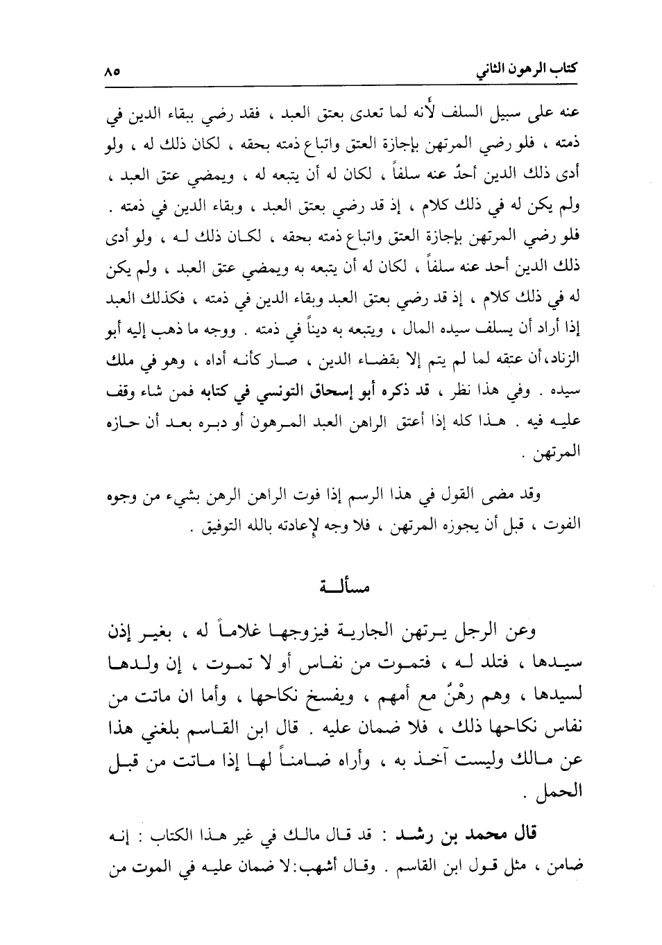 مسألة وعن الرجل يرتهن الجارية فيزوجها غلاما له، بغير إذن سيدها، فتلد له، فتموت من نفاس أو لا تموت، إن ولدها لسيدها، وهم رهن مع أمهم، ويفسخ نكاحها، وأما إن ماتت من نفاس نكاحها ذلك، فلا ضمان عليه. قال ابن القاسم بلغني هذا عن مالك ولست آخذ به، وأراه ضامنا لها إذا ماتت من قبل الحمل.