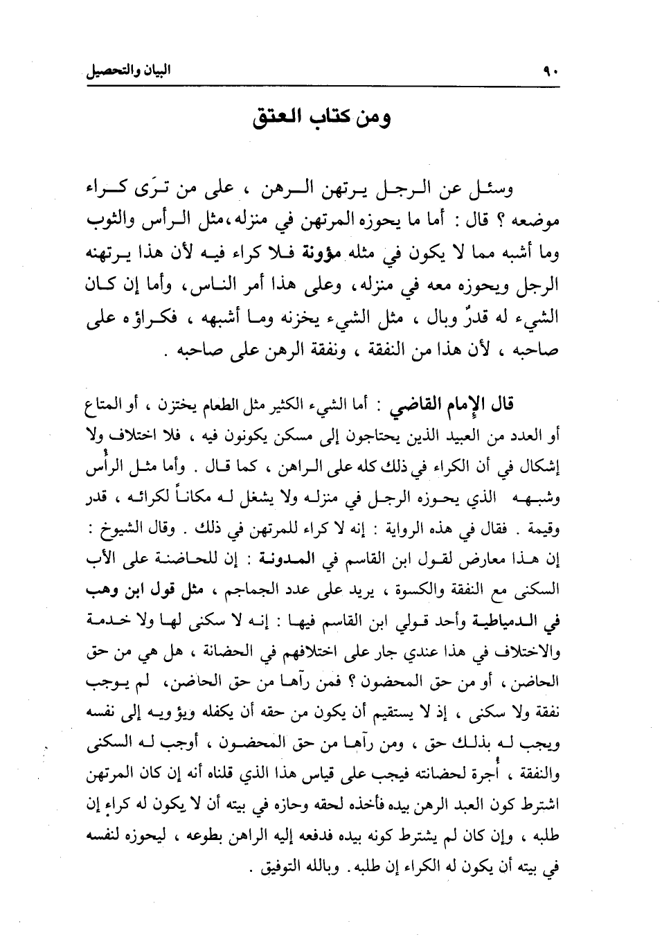 قال الإمام القاضي: أما الشيء الكثير مثل الطعام يختزن، أو المتاع أو العدد من العبيد الذين يحتاجون إلى مسكن يكونون فيه، فلا اختلاف ولا إشكال في أن الكراء في ذلك كله على الراهن، كما قال. وأما مثل الرأس وشبهه الذي يحوزه الرجل في منزله ولا يشغل له مكانا لكرائه، قدر وقيمة. فقال في هذه الرواية: إنه لا كراء للمرتهن في ذلك. وقال الشيوخ: إن هذا معارض لقول ابن القاسم في المدونة: إن للحاضنة على الأب السكنى مع النفقة والكسوة، يريد على عدد الجماجم، مثل قول ابن وهب في الدمياطية وأحد قولي ابن القاسم فيها: إنه لا سكنى لها ولا خدمة والاختلاف في هذا عندي جار على اختلافهم في الحضانة، هل هي من حق الحاضن، أو من حق المحضون؟ فمن رآها من حق الحاضن، لم يوجب نفقة ولا سكنى؛ إذ لا يستقيم أن يكون من حقه أن يكفله ويؤويه إلى نفسه ويجب له بذلك حق، ومن رآها من حق المحضون، أوجب له السكنى والنفقة، أجرة لحضانته فيجب على قياس هذا الذي قلناه أنه إن كان المرتهن اشترط كون العبد الرهن بيده فأخذه لحقه وحازه في بيته أن لا يكون له كراء إن طلبه، وإن كان لم يشترط كونه بيده فدفعه إليه الراهن بطوعه، ليحوزه لنفسه في بيته أن يكون له الكراء إن طلبه. وبالله التوفيق.