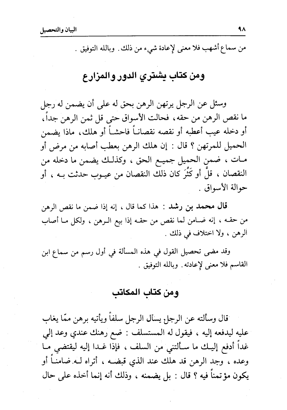 ومن كتاب المكاتب قال وسألته عن الرجل يسأل الرجل سلفا ويأتيه برهن مما يغاب عليه ليدفعه إليه، فيقول له المستسلف: ضع رهنك عندي وعد إلي غدا أدفع إليك ما سألتني من السلف، فإذا غدا إليه ليقتضي ما وعده، وجد الرهن قد هلك عند الذي قبضه، أتراه له. ضامنا أو يكون مؤتمنا فيه؟ قال: بل يضمنه، وذلك أنه إنما أخذه على حال