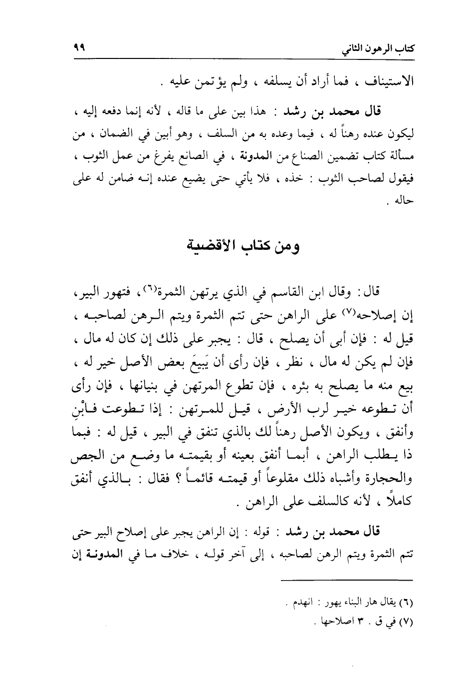 قال محمد بن رشد: قوله: إن الراهن يجبر على إصلاح البئر حتى تتم الثمرة ويتم الرهن لصاحبه، إلى آخر قوله، خلاف ما في المدونة إن