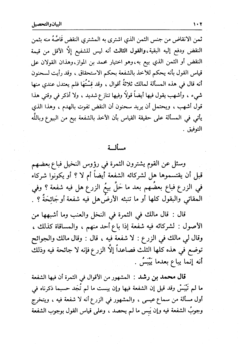 مسألة وسئل عن القوم يشترون الثمرة في رؤوس النخيل فباع بعضهم قبل أن يقتسموها هل لشركائه الشفعة أيضاً أم لا؟ أو يكونوا شركاء في الزرع فباع بعضُهم بعد ما حَلَّ بيعُ الزرع هل فيه شفعة؟ وفي المقاتي والبقول كلها أو ما تنبته الأرضُ هل فيه شفعة أو جَائِحَةٌ؟ . قال: قال مالك في الثمرة في النخل والعنب وما أشبهها من الأصول: لشركائه فيه شفعة إذا باع أحد منهم، والمساقاة كذلك، وقال لي مالك في الزرع: لا شفعة فيه، قال: وقال مالك: والجوائح توضع في هذه كلها الثلث فصاعداً إلَّا الزرع فإنه لا جائحة فيه وذلك أنه إنما يباع بعدما يَيْبَسُ.