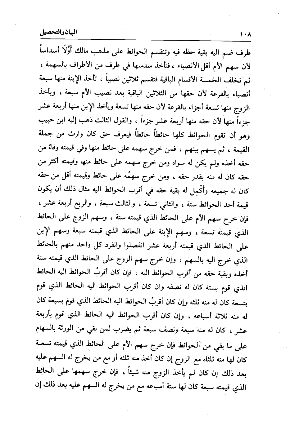 طرف ضم إليه بقية حظه فيه وتنقسم الحوائط على مذهب مالك أَولا أسداساً لأن سهم الأم أقل الأنصباء، فتأخذ سدسها في طرف من الأطراف بالسهمة، ثم تخلف الخمسة الأقسام الباقية فتقسم ثلاثين نصيباً، تأخذ الاِبنة منها سبعة أنصباء بالقرعة؛ لأن حقها من الثلاثين الباقية بعد نصيب الأم سبعة، ويأخذ الزوجِ منها تسعة أجزاء بالقرعة لأن حقه منها تسعة ويأخذ الاِبن منها أربعة عشر جزءا منها لأن حقه منها أربعة عشر جزءا، والقول الثالث ذهب إليه ابن حبيب وهو أن تقوم الحوائط كلها حائطا حائطا فيعرف حق كان وارث من جملة القيمة، ثم يسهم بينهم، فمن خرج سهمه على حائط منها وفي قيمته وفاءٌ من حقه أخذه ولم يكن له سواه ومن خرج سهمه على حائط منها وقيمته أكثر من حقه كان له منه بقدر حقه، ومن خرج سهمُه على حائط وقيمته أقل من حقه كان له جميعه وأَكْمِل له بقية حقه في أقرب الحوائط إليه مثَال ذلك أن يكون قيمة أحد الحوائط ستة، والثاني تسعة، والثالث سبعة، والربع أربعة عشر، فإن خرج سهم الأم على الحائط الذي قيمته ستة، وسهم الزوج على الحائط الذي قيمته تسعة، وسهم الاِبنة على الحائط الذي قيمته سبعة وسهم الِابن على الحائط الذي قيمته أربعة عشر انفصلوا وانفرد كل واحد منهم بالحائط الذي خرج إليه بالسهم، وإن خرج سهم الزوج على الحائط الذي قيمته ستة أخذه وبقية حقه من أقرب الحوائط إليه، فإن كان أقرب الحوائط إليه الحائط الذي قوم بستة كان له نصفه وإن كان أقرب الحوائط إليه الحائط الذي قوم بتسعة كان له منه ثلثه وإن كان أقرب الحوائط إليه الحائط الذي قوم بسبعة كان له منه ثلاثة أسباعه، وإن كان أقرب الحوائط إليه الحائط الذي قوم بأربعة عشر، كان له منه سبعة ونصف سبعة ثم يضرب لمن بقي من الورثة بالسهام على ما بقي من الحوائط فإن خرج سهم الأم على الحائط الذي قيمته تسعة كان لها منه ثلثاه مع الزوج إن كان أخذ منه ثلثه أو مع من يخرج له السهم عليه بعد ذلك إن كان لم يأخذ الزوج منه شيئاً، فإن خرج سهمها على الحائط الذي قيمته سبعة كان لها ستة أسباعه مع من يخرج له السهم عليه بعد ذلك إن