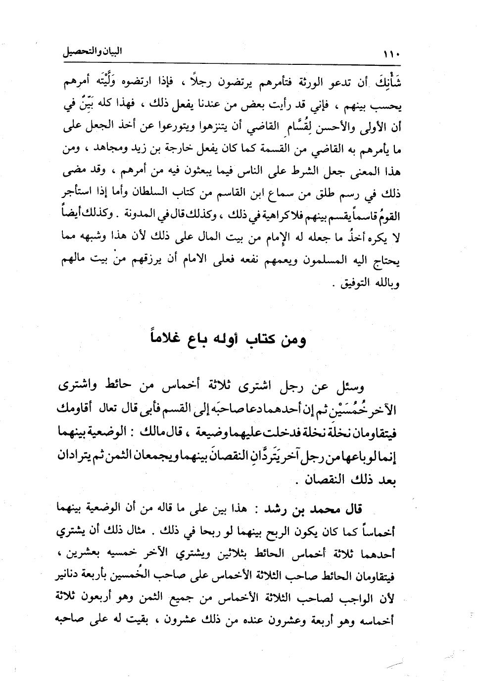 شَأْنِكَ أن تدعو الورثة فتأمرهم يرتضون رجلًا، فإذا ارتضوه وَلَّيْتَه أمرهم يحسب بينهم، فإني قد رأيت بعض من عندنا يفعل ذلك، فهذا كله بَيِّن في أن الأولى والأحسن لِقُسَّام القاضي أن يتنزهوا ويتورعوا عن أخذ الجعل على ما يأمرهم به القاضي من القسمة؛ كما كان يفعل خارجة بن زيد ومجاهد، ومن هذا المعنى جعل الشرط على الناس فيما يبعثون فيه من أمرهم، وقد مضى ذلك في رسم طلق من سماع ابن القاسم من كتاب السلطان، وأما إذا استأجر القومُ قاسماً يقسم بينهم فلا كراهية في ذلك، وكذلك قال في المدونة. وكذلك أيضاً لا يكره أخذُ ما جعله له الإِمام من بيت المال على ذلك؛ لأن هذا وشبهه مما يحتاج إليه المسلمون ويعمهم نفعه فعلى الإمام أن يرزقهم من بيت مالهم، وبالله التوفيق.