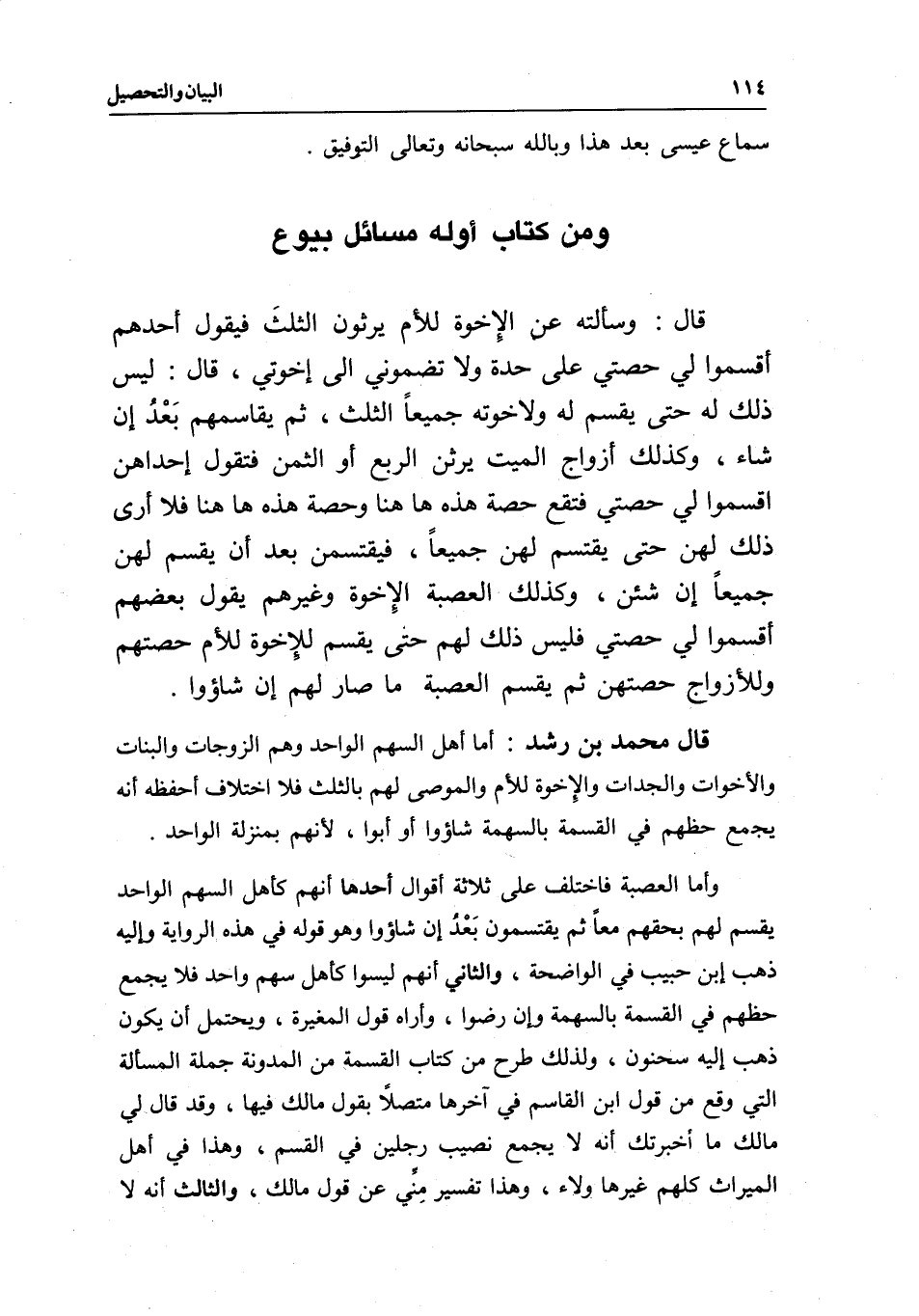 ومن كتاب أوله مسائل بيوع قال: وسألته عن الإِخوة للأم يرثون الثلثَ فيقول أحدهم: اقسموا لي حصتي على حدة ولا تضموني إلى إخوتي، قال: ليس ذلك له حتى يقسم له ولإخوته جميعاً الثلث، ثم يقاسمهم بَعْدُ إن شاء، وكذلك أزواج الميت يرثن الربع أو الثمن فتقول إحداهن: اقسموا لي حصتي فتقع حصة هذه هاهنا وحصة هذه هاهنا فلا أرى ذلك لهن حتى يقتسم لهن جميعاً، فيقتسمن بعد أن يقسم لهن جميعاً إن شئن، وكذلك العصبة الإِخوة وغيرهم يقول بعضهم: اقسموا لي حصتي فليس ذلك لهم حتى يقسم للإِخوة للأم حصتهم وللأزواج حصتهن ثم يقسم العصبة ما صار لهم إن شاؤوا.