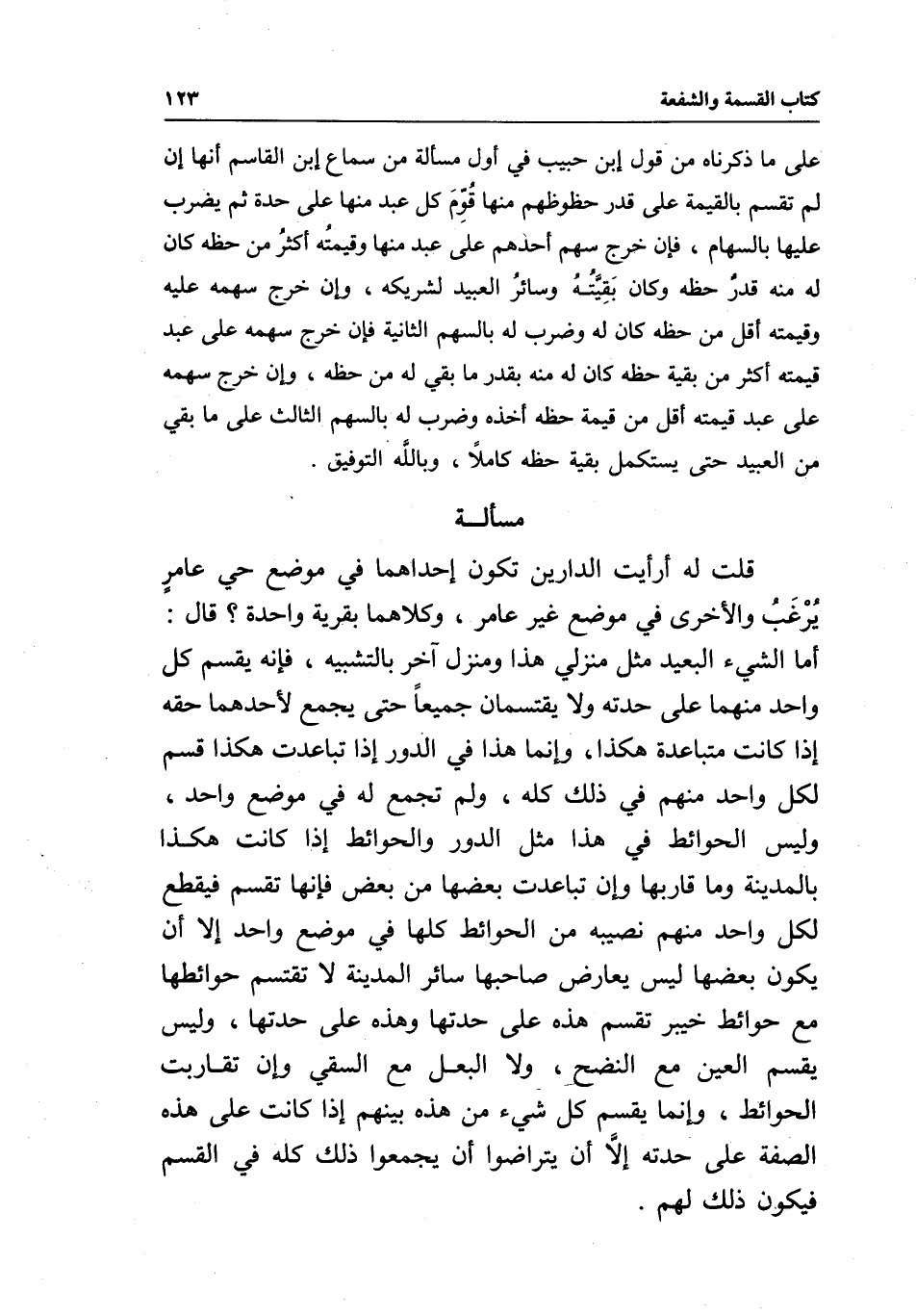 مسألة قلت له: أرأيت الدارين تكون إحداهما في موضع حي عامرٍ يُرْغَبُ والأخرى في موضع غير عامر، وكلاهما بقرية واحدة؟ قال: أما الشيء البعيد مثل منزلي هذا ومنزل آخر بالتشبيه، فإنه يقسم كل واحد منهما على حدته ولا يقتسمان جميعاً حتى يجمع لأحدهما حقه إذا كانت متباعدة هكذا، وإنما هذا في الدور إذا تباعدت هكذا قسم لكل واحد منهم في ذلك كله، ولم تجمع له في موضع واحد، وليس الحوائط في هذا مثل الدور والحوائط إذا كانت هكذا بالمدينة وما قاربها وإن تباعدت بعضها من بعض فإنها تقسم فيقطع لكل واحد منهم نصيبه من الحوائط كلها في موضع واحد إلا أن يكون بعضها ليس يعارض صاحبها سائر المدينة لا تقتسم حوائطها مع حوائط خيبر تقسم هذه على حدتها وهذه على حدتها، وليس يقسم العين مع النضح، ولا البعل مع السقي وإن تقاربت الحوائط، وإنما يقسم كل شيء من هذه بينهم إذا كانت على هذه الصفة على حدته إلَّا أن يتراضوا أن يجمعوا ذلك كله في القسم فيكون ذلك لهم.