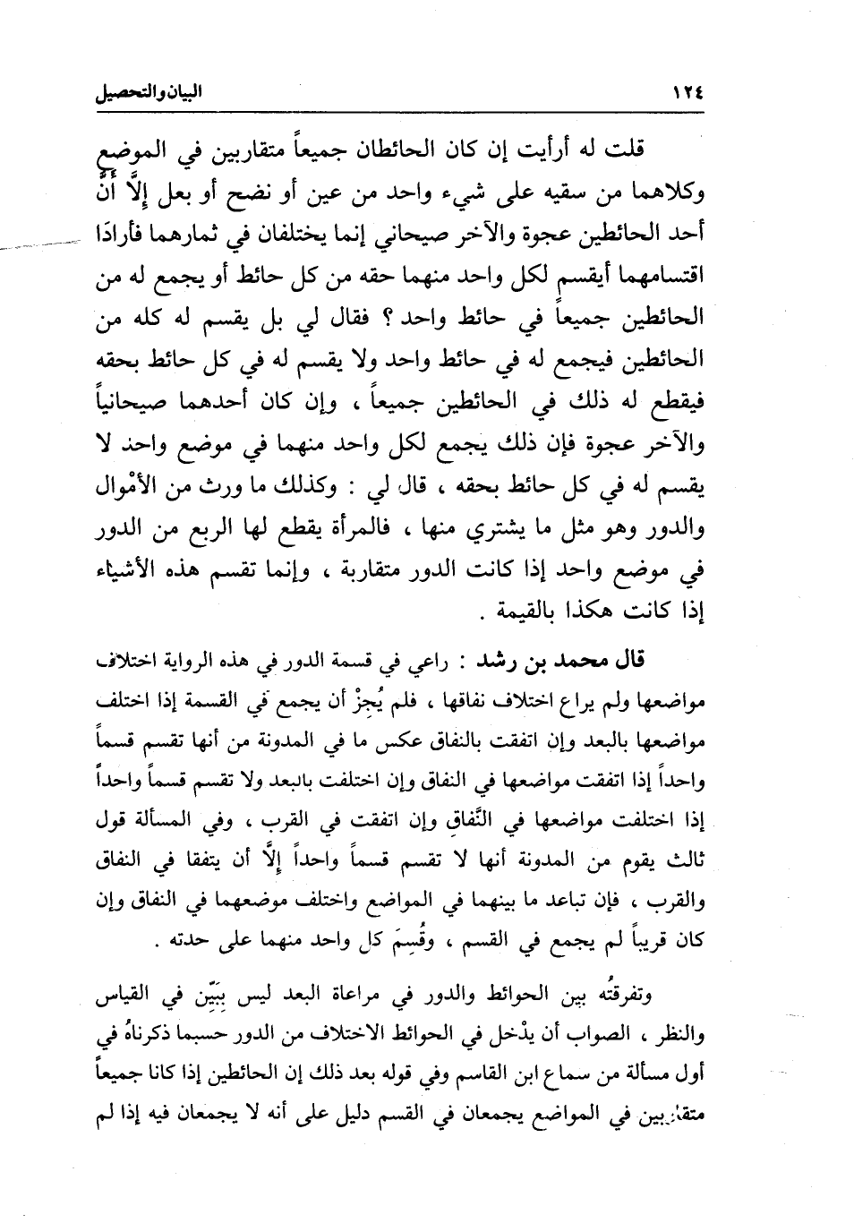 قال محمد بن رشد: راعي في قسمة الدور في هذه الرواية اختلاف مواضعها ولم يراع اختلاف نفاقها، فلم يُجِزْ أن يجمع في القسمة إذا اختلف مواضعها بالبعد وإن اتفقت بالنفاق عكس ما في المدونة من أنها تقسم قسماً واحداً إذا اتفقت مواضعها في النفاق وإن اختلفت بالبعد ولا تقسم قسماً واحداً إذا اختلفت مواضعها في النَّفاقِ وإن اتفقت في القرب، وفي المسألة قول ثالث يقوم من المدونة أنها لا تقسم قسماً واحداً إِلا أن يتفقا في النفاق والقرب، فإن تباعد ما بينهما في المواضع واختلف موضعهما في النفاق وإن كان قريباً لم يجمع في القسم، وقُسِمَ كل واحد منهما على حدته.