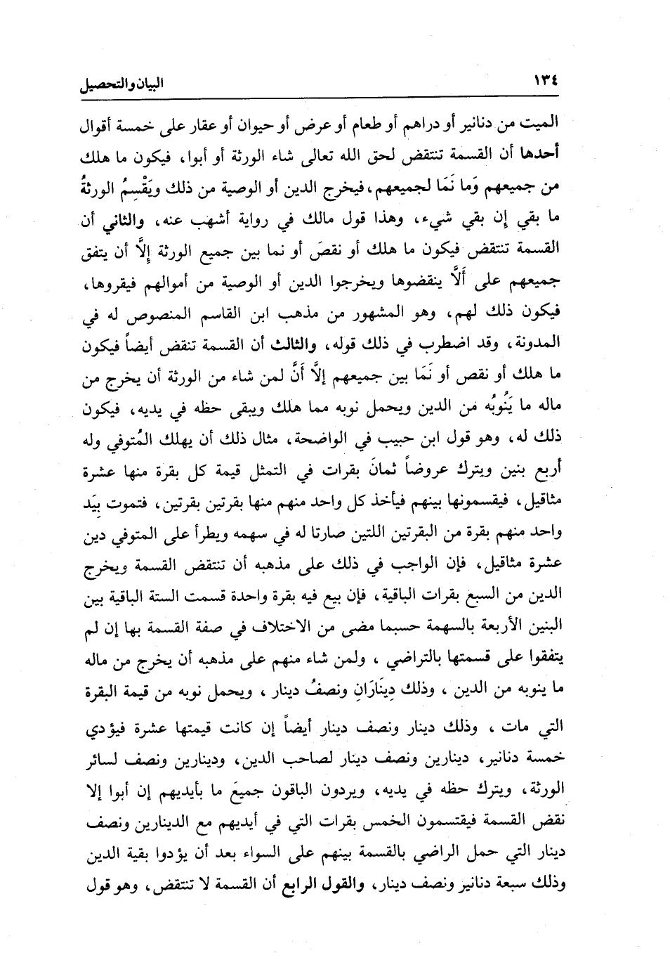 الميت من دنانير أو دراهم أو طعام أو عرض أو حيوان أو عقار على خمسة أقوال، أحدها أن القسمة تنتقض لحق الله تعالى شاء الورثة أو أبوا، فيكون ما هلك من جميعهم وَما نَمَا لجميعهم، فيخرج الدين أو الوصية من ذلك ويَقْسِمُ الورثةُ ما بقي إِن بقي شيء، وهذا قول مالك في رواية أشهب عنه، والثاني أن القسمة تنتقض فيكون ما هلك أو نقصَ أو نما بين جميع الورثة إِلَّا أن يتفق جميعهم على أَلَّا ينقضوها ويخرجوا الدين أو الوصية من أموالهم فيقروها، فيكون ذلك لهم، وهو المشهور من مذهب ابن القاسم المنصوص له في المدونة، وقد اضطرب في ذلك قوله، والثالث أن القسمة تنقض أيضا فيكون ما هلك أو نقص أو نَمَا بين جميعهم إلَّا أَنَّ لمن شاء من الورثة أن يخرج من ماله ما يَنُوبُه من الدين ويحمل نوبه مما هلك ويبقى حظه في يديه، فيكون ذلك له، وهو قول ابن حبيب في الواضحة، مثال ذلك أن يهَلك المُتوفى وله أربع بنين ويترك عروضا ثمانَ بقرات في التمثل قيمة كل بقرة منها عشرة مثاقيل، فيقسمونها بينهم فيأخذ كل واحد منهم منها بقرتين بقرتين، فتموت بِيَد واحد منهم بقرة من البقرتين اللتين صارتا له في سهمه ويطرأ على المتوفى دين عشرة مثاقيل، فإن الواجب في ذلك على مذهبه أن تنتقض القسمة ويخرج الدين من السبع بقرات الباقية، فإن بيع فيه بقرة واحدة قسمت الستة الباقية بين البنين الأربعة بالسهمة حسبما مضى من الاختلاف في صفة القسمة بها إن لم يتفقوا على قسمتها بالتراضي، ولمن شاء منهم على مذهبه أن يخرج من ماله ما ينوبه من الدين، وذلك دِينَارَانِ ونصفُ دينار، ويحمل نوبه من قيمة البقرة التي مات، وذلك دينار ونصف دينار أيضا إن كانت قيمتها عشرة فيؤدي خمسة دنانير، دينارين ونصف دينار لصاحب الدين، ودينارين ونصف لسائر الورثة، ويترك حظه في يديه، ويردون الباقون جميعَ ما بأيديهم إن أبوا إلا نقض القسمة فيقتسمون الخمس بقرات التي في أيديهم مع الدينارين ونصف دينار التي حمل الراضي بالقسمة بينهم على السواء بعد أن يؤدوا بقية الدين وذلك سبعة دنانير ونصف دينار، والقول الرابع أن القسمة لا تنتقض، وهو قول
