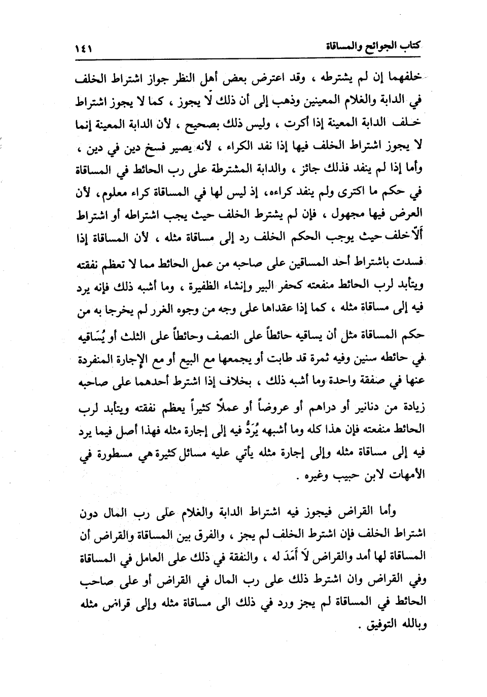 وأما القراض فيجوز فيه اشتراط الدابة والغلام على رب المال دون اشتراط الخلف، فإن اشترط الخلف لم يجز، والفرق بين المساقاة والقراض أن المساقاة لها أمد والقراض لَا أَمَدَ له، والنفقة في ذلك على العامل في المساقاة وفي القراض وإن اشترط ذلك على رب المال في القراض أو على صاحب الحائط في المساقاة لم يجز ورد في ذلك إلى مساقاة مثله وإلى قراض مثله وبالله التوفيق.