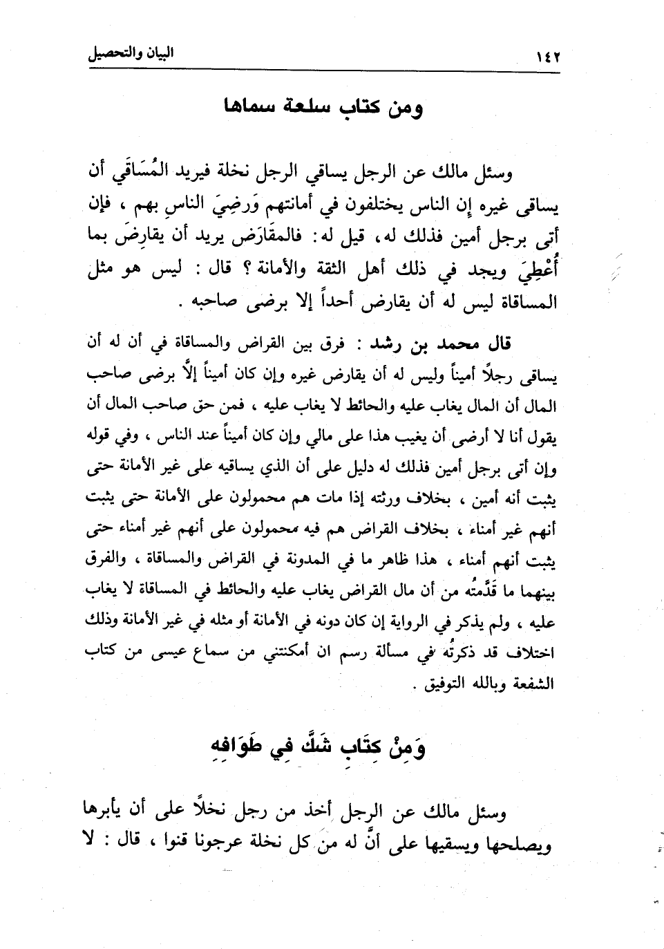 ومن كتاب شَكَّ فِي طَوَافِهِ وسئل مالك عن الرجل أخذ من رجل نخلا على أن يأبرها ويصلحها ويسقيها على أنَّ له من كل نخلة عرجونا قنوا، قال: لا
