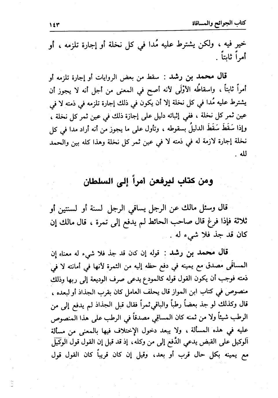 ومن كتاب ليرفعن أمرا إلى السلطان قال: وسئل مالك عن الرجل يساقي الرجل لسنة أو لسنتين أو ثلاثة، فإذا فرغ قال صاحب الحائط: لم يدفع إلي تمرة، قال مالك: إن كان قد جذ فلا شيء له.