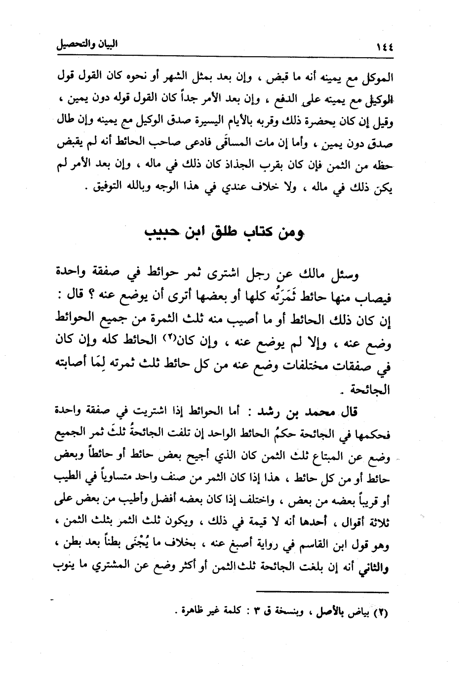 وسئل مالك عن رجل اشترى ثمر حوائط في صفقة واحدة فيُصاب منها حائط ثمرته كلها أو بعضها، أترى أن يوضع عَنه؟ قال: إن كان ذلك الحائط أو ما أصيب منه ثلث الثمرة من جميع الحوائط وضع عنه، وإلا لم يوضع عنه، وإن كان الحائط كله، وإن كان في صفقات مختلفات وضع عنه من كل حائط ثلث ثمرته لِمَا أصابته الجائحة.