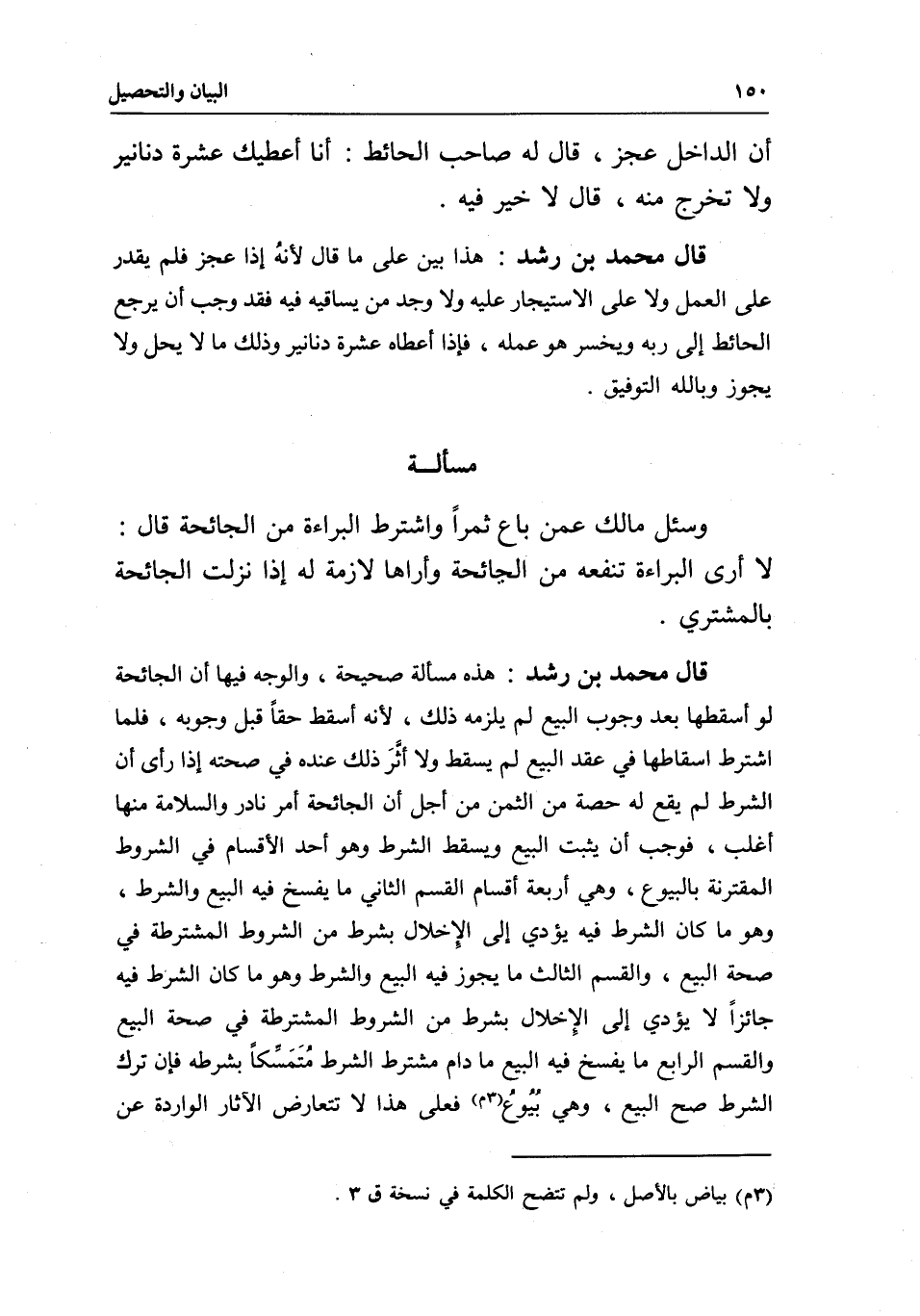 قال محمد بن رشد: هذه مسألة صحيحة، والوجه فيها أن الجائحة لو أسقطها بعد وجوب البيع لم يلزمه ذلك؛ لأنه أسقط حقا قبل وجوبه، فلما اشترط إسقاطها في عقد البيع لم يسقط ولا أثَّرَ ذلك عنده في صحته إذا رأى أن الشرط لم يقع له حصة من الثمن من أجل أن الجائحة أمر نادر والسلامة منها أغلب، فوجب أن يثبت البيع ويسقط الشرط وهو أحد الأقسام في الشروط المقترنة بالبيوع، وهي أربعة أقسام القسم الثاني ما يفسخ فيه البيع والشرط، وهو ما كان الشرط فيه يؤدي إلى الِإخلال بشرط من الشروط المشترطة في صحة البيع، والقسم الثالث ما يجوز فيه البيع والشرط وهو ما كان الشرط فيه جائزا لا يؤدي إلى الإِخلال بشرط من الشروط المشترطة في صحة البيع والقسم الرابع ما يفسخ فيه البيع ما دام مشترط الشرط مُتَمَسِّكا بشرطه فإن ترك الشرط صح البيع، وهي بُيُوعُ فعلى هذا لا تتعارض الآثار الواردة عن