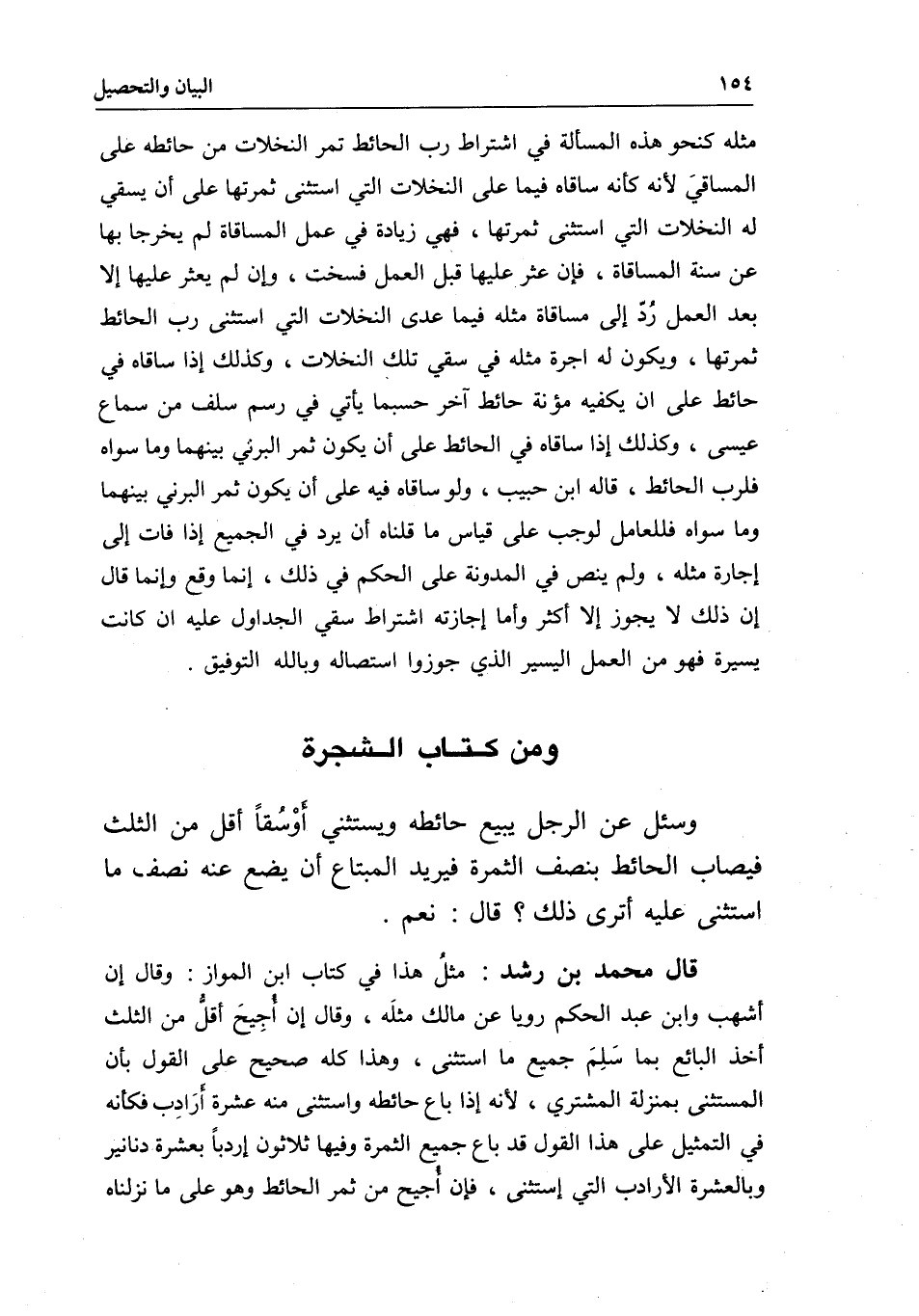مثله كنحو هذه المسألة في اشتراط رب الحائط تمر النخلات من حائطه على المساقيَ؛ لأنه كأنه ساقاه فيما على النخلات التي استثنى ثمرتها على أن يسقي له النخلات التي استثنى ثمرتها، فهي زيادة في عمل المساقاة لم يخرجا بها عن سنة المساقاة، فإن عثر عليها قبل العمل فسخت، وإن لم يعثر عليها إلا بعد العمل رُدّ إلى مساقاة مثله فيما عدى النخلات التي استثنى رب الحائط ثمرتها، ويكون له أجرة مثله في سقي تلك النخلات، وكذلك إذا ساقاه في حائط على أن يكفيه مؤنة حائط آخر حسبما يأتي في رسم سلف من سماع عيسى، وكذلك إذا ساقاه في الحائط على أن يكون ثمر البرني بينهما وما سواه فلرب الحائط، قاله ابن حبيب، ولو ساقاه فيه على أن يكون ثمر البرني بينهما وما سواه فللعامل لوجب على قياس ما قلناه أن يرد في الجميع إذا فات إلى إجارة مثله، ولم ينص في المدونة على الحكم في ذلك، إنما وقع وإنما قال إن ذلك لا يجوز إلا أكثر وأما إجازته اشتراط سقي الجداول عليه إن كانت يسيرة فهو من العمل اليسير الذي جوزوا استئصاله وبالله التوفيق.