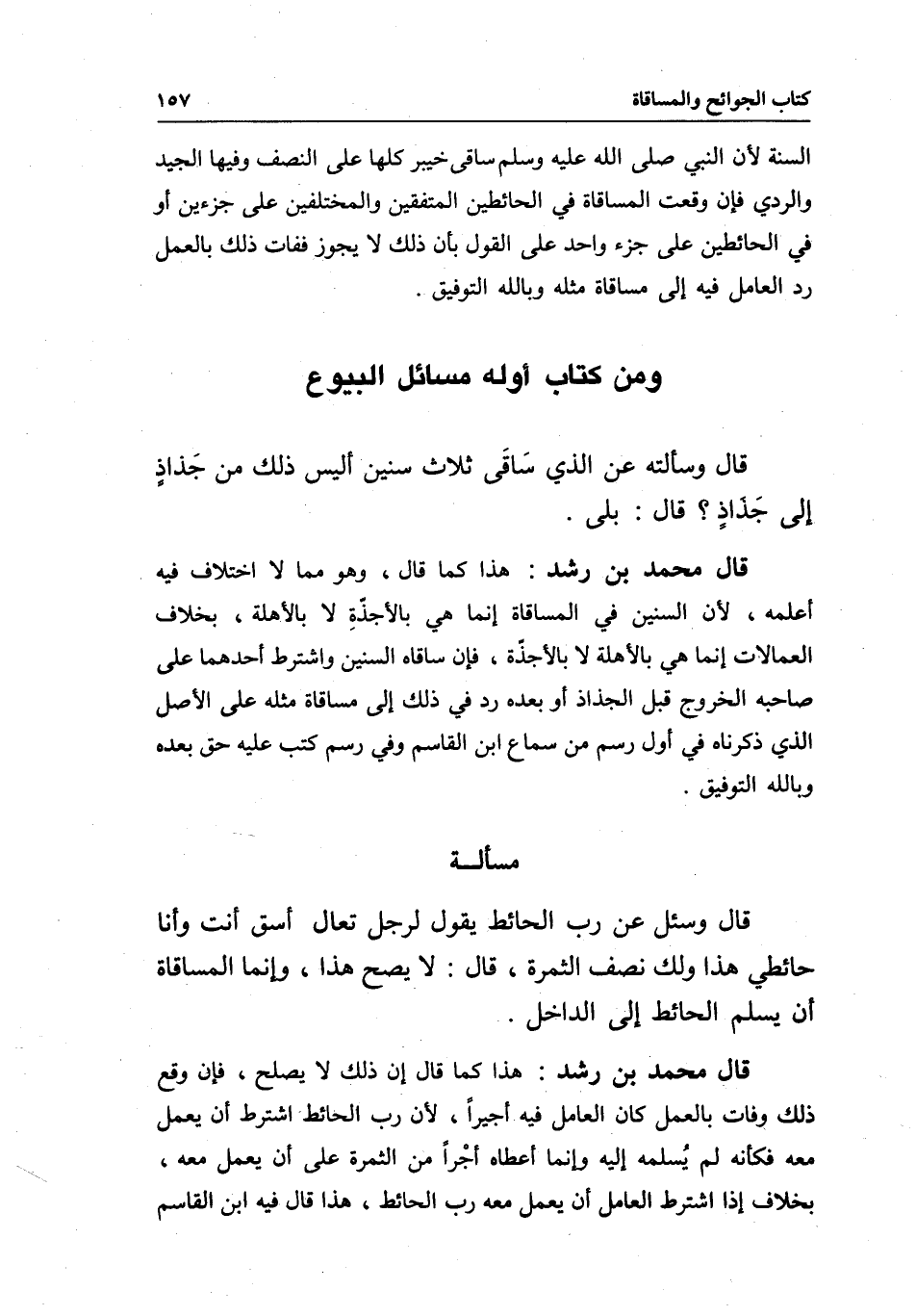 مسألة قال وسئل عن رب الحائط يقول لرجل تعال اسق أنت وأنا حائطي هذا ولك نصف الثمرة، قال: لا يصح هذا، وإنما المساقاة أن يسلم الحائط إلى الداخل.