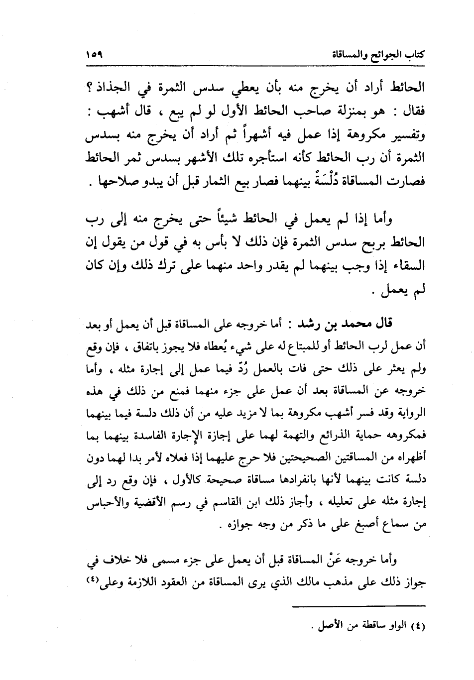 قال محمد بن رشد: أما خروجه على المساقاة قبل أن يعمل أو بعد أن عمل لرب الحائط أو للمبتاع له على شيء يُعطاه فلا يجوز باتفاق، فإن وقع ولم يعثر على ذلك حتى فات بالعمل ردّ فيما عمل إلى إجارة مثله، وأما خروجه عن المساقاة بعد أن عمل على جزء منهما فمنع من ذلك في هذه الرواية، وقد فسر أشهب مكروهة بما لا مزيد عليه من أن ذلك دلسة فيما بينهما فمكروهه حماية الذرائع والتهمة لهما على إجازة الإِجارة الفاسدة بينهما بما أظهراه من المساقتين الصحيحتين فلا حرج عليهما إذا فعلاه لأمر بدا لهما دون دلسة كانت بينهما لأنها بانفرادها مساقاة صحيحة كالأول، فإن وقع رد إلى إجارة مثله على تعليله، وأجاز ذلك ابن القاسم في رسم الأقضية والأحباس من سماع أصبغ على ما ذكر من وجه جوازه.