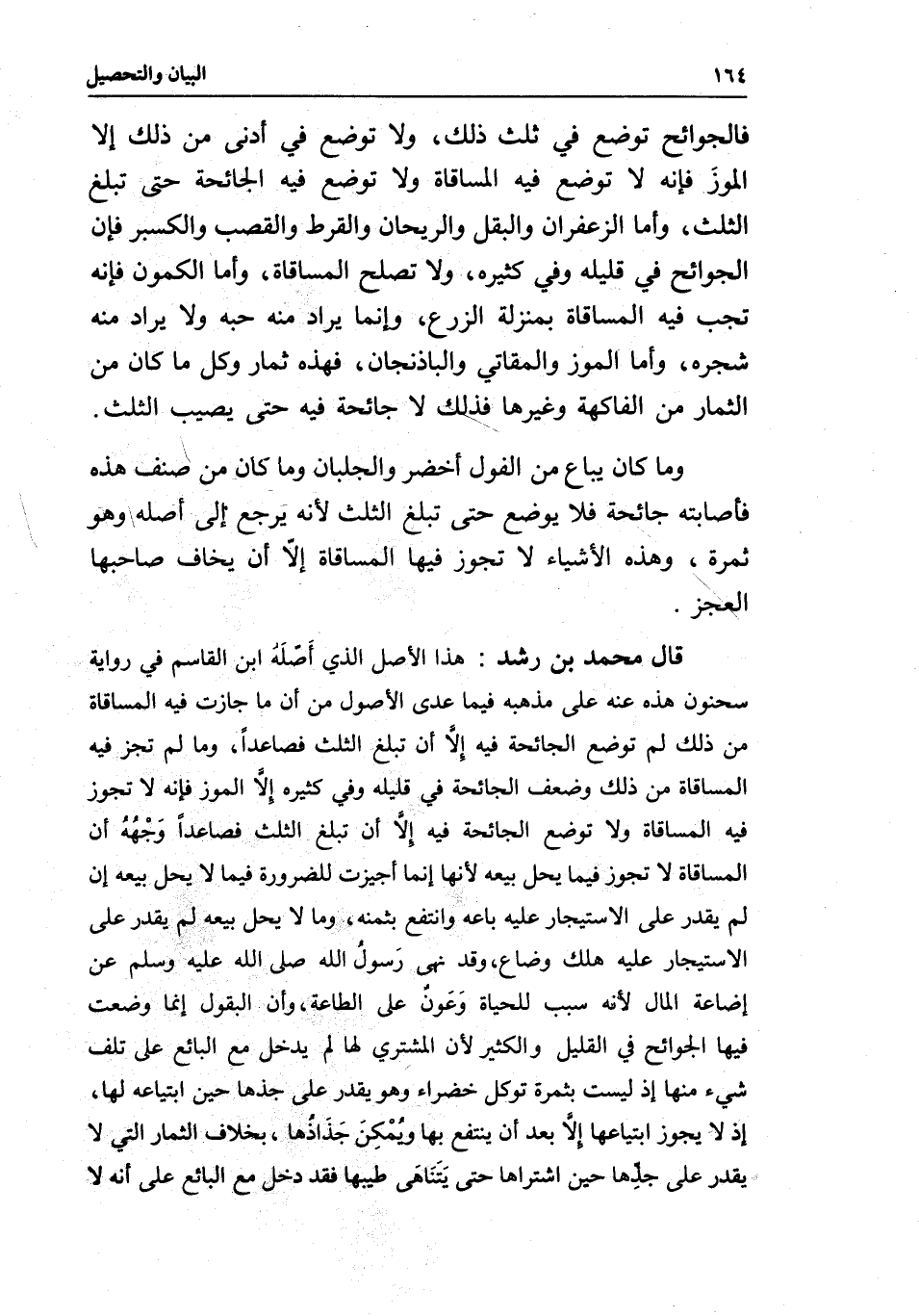 قال محمد بن رشد: هذا الأصل الذي أَصّلَه ابن القاسم في رواية سحنون هذه عنه على مذهبه فيما عدى الأصول من أن ما جازت فيه المساقاة من ذلك لم توضع الجائحة فيه إلّاَ أن تبلغ الثلث فصاعدا، وما لم تجز فيه المساقاة من ذلك وضعف الجائحة في قليله وفي كثيره إلا الموز فإنه لا تجوز فيه المساقاهَ ولا توضع الجائحة فيه إِلَّا أن تبلغ الثلث فصاعدا وجههُ أن المساقاة لا تجوز فيما يحل بيعه لأنها إنما أجيزت للضرورة فيما لا يحل بيعه إن لم يقدر على الاستيجار عليه باعه وانتفع بثمنه، وما لا يحل بيعه لم يقدر على الاستيجار عليه هلك وضاع، وقد «نهى رَسولُ الله - صَلَّى اللَّهُ عَلَيْهِ وَسَلَّمَ - عن إضاعة المال» لأنه سبب للحياة وَعَونٌ على الطاعة، وأن البقول إنما وضعت فيها الجوائح لا القليل والكثير لأن المشتري لها لم يدخل مع البائع على تلف شيء منها إذ ليست بثمرة توكل خضراء وهو يقدر على جذها حين ابتياعه لها، إذ لا يجوز ابتياعها إِلا بعد أن ينتفع بها ويُمكِن جَذَاذُها، بخلاف الثمار التي لا يقدر على جذها حين اشتراها حتى يتناهى طيبها فقد دخل مع البائع على أنه لا